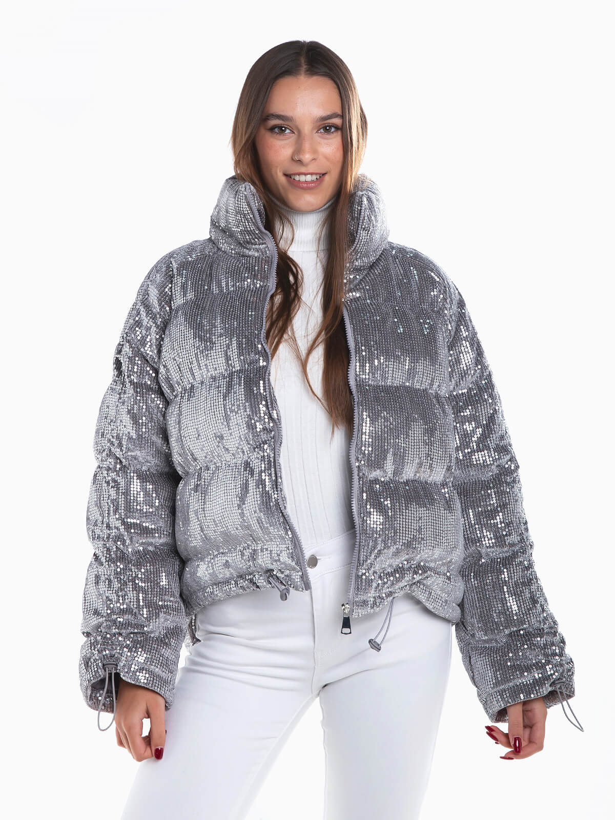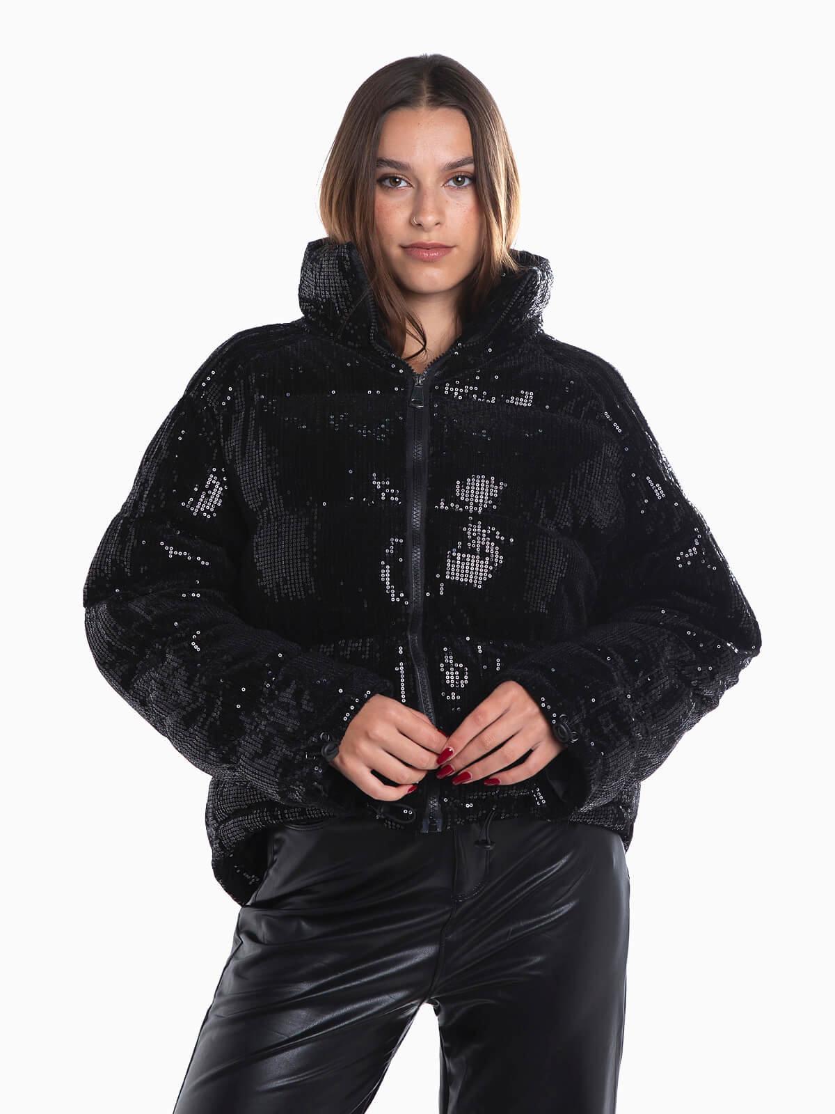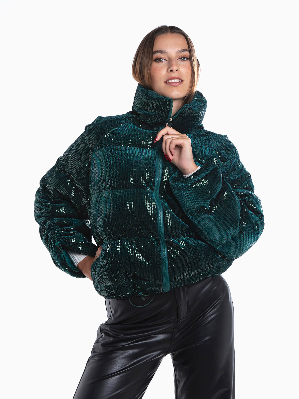 Blusão acolchoado com lantejoulas para efeito brilhante. Blusão em tecido aveludado com elástico para ajustar na base e mangas. Gola alta. 2 bolsos. Aperto de fecho zíper.