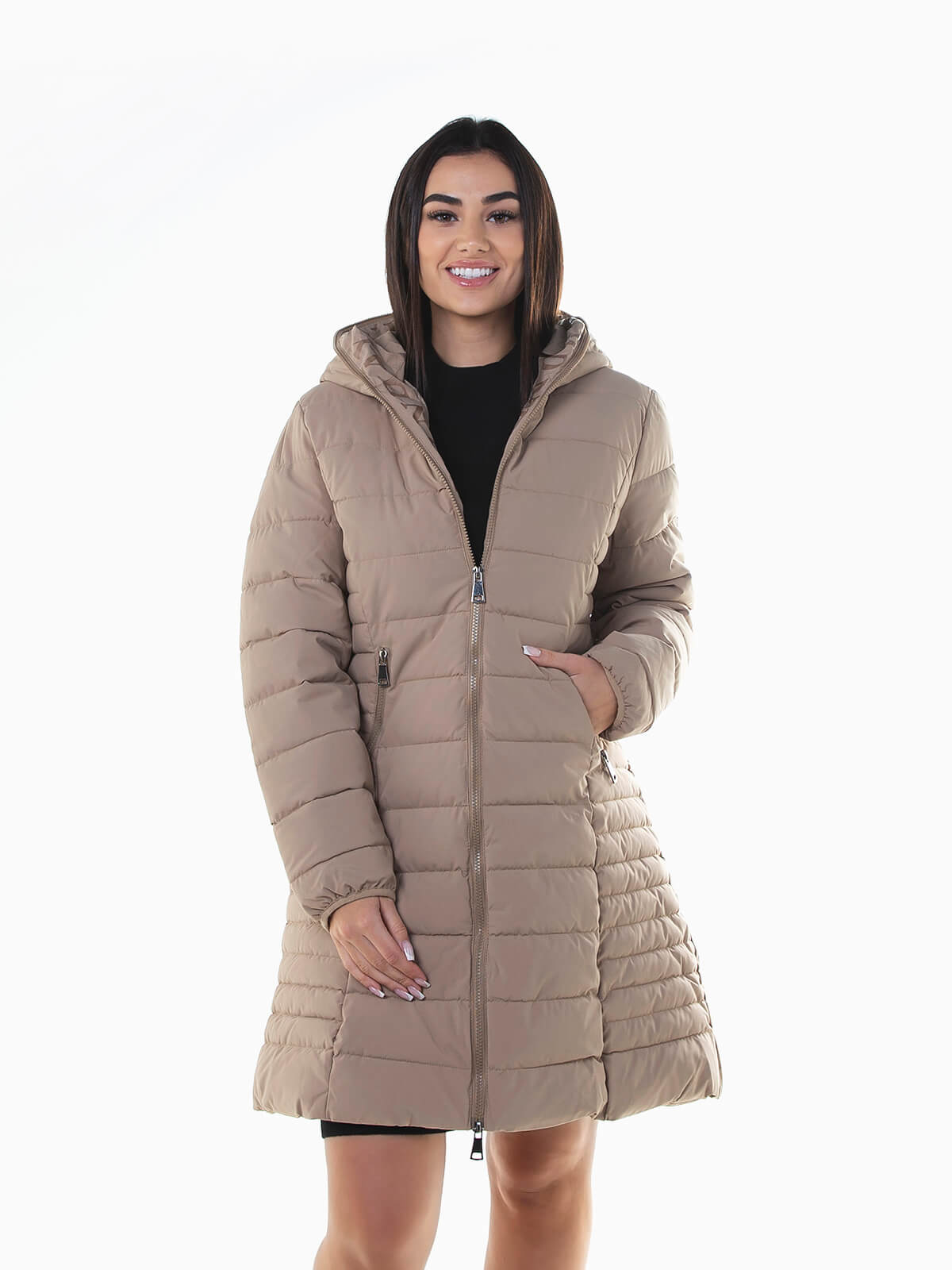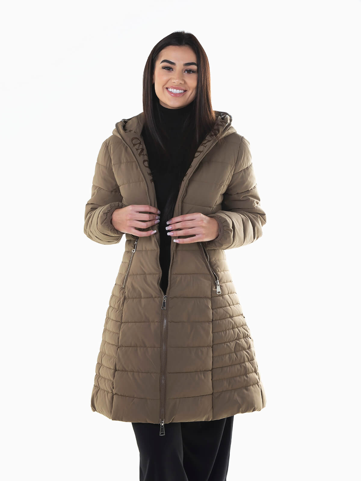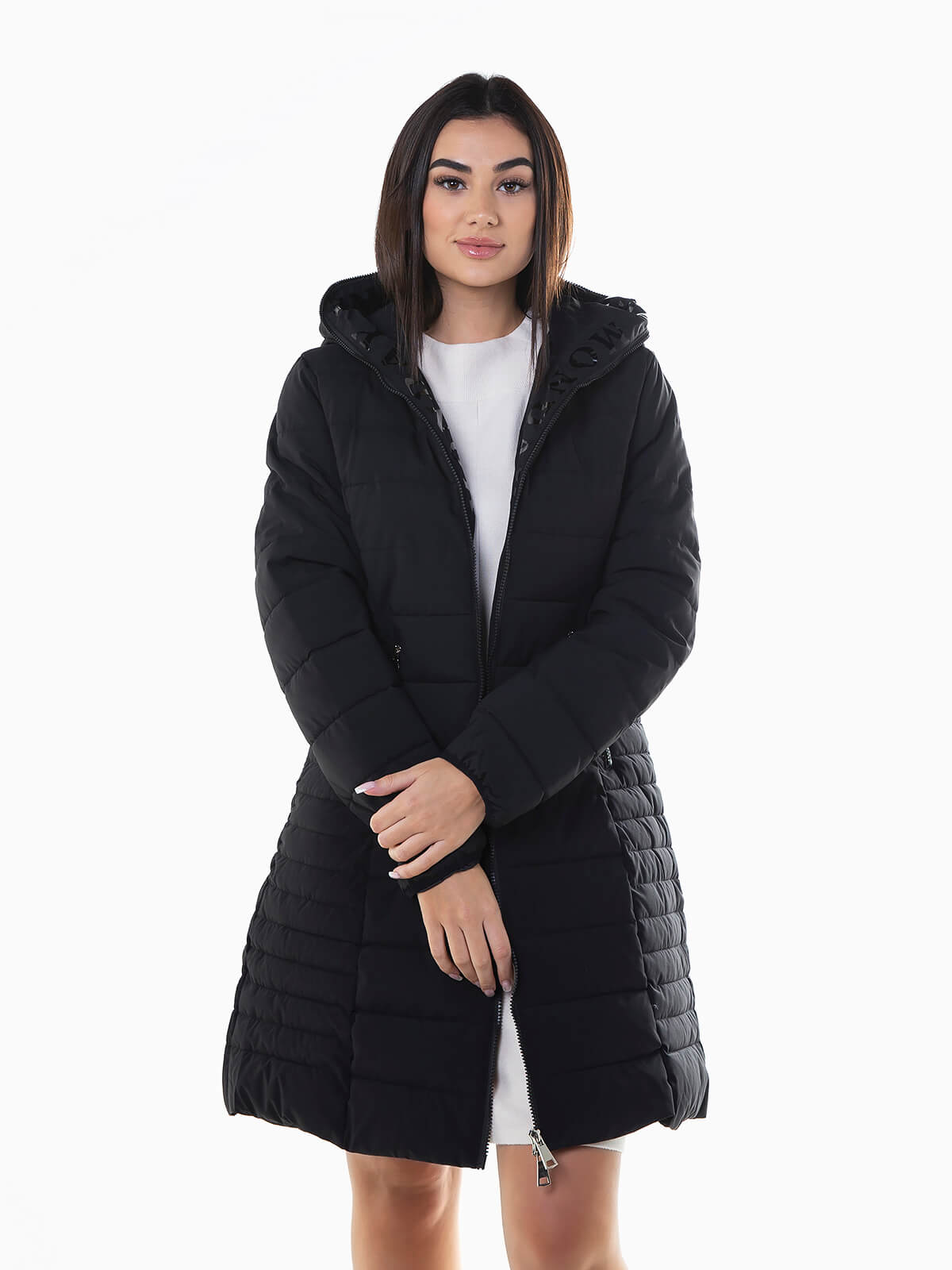 Blusão acolchoado comprido cintado para senhora. Blusão impermeável com capuz e letras estampadas no interior. 2 bolsos. Aperto fecho zíper.