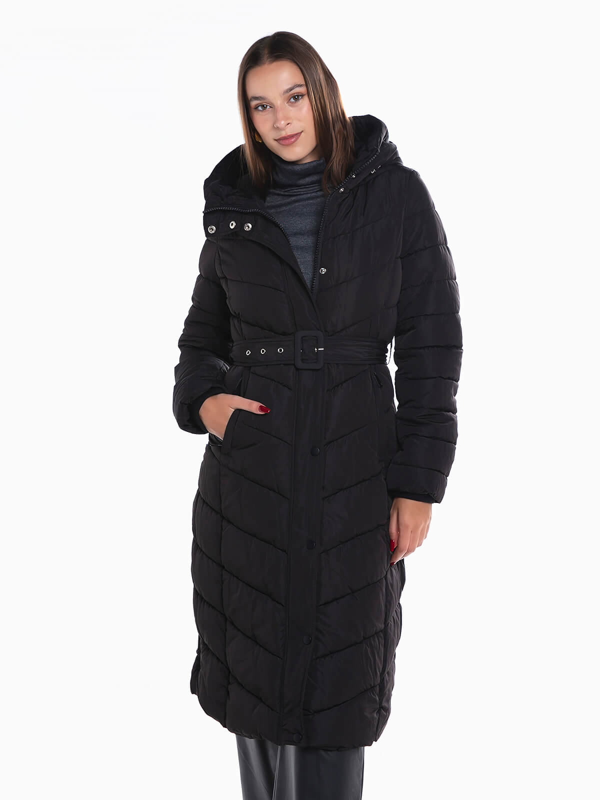 Blusão acolchoado comprido com cinto removível para ajustar. Blusão impermeável com capuz e elástico para ajustar. Manga comprida. 2 bolsos. Aperto fecho zíper e botões pressão.