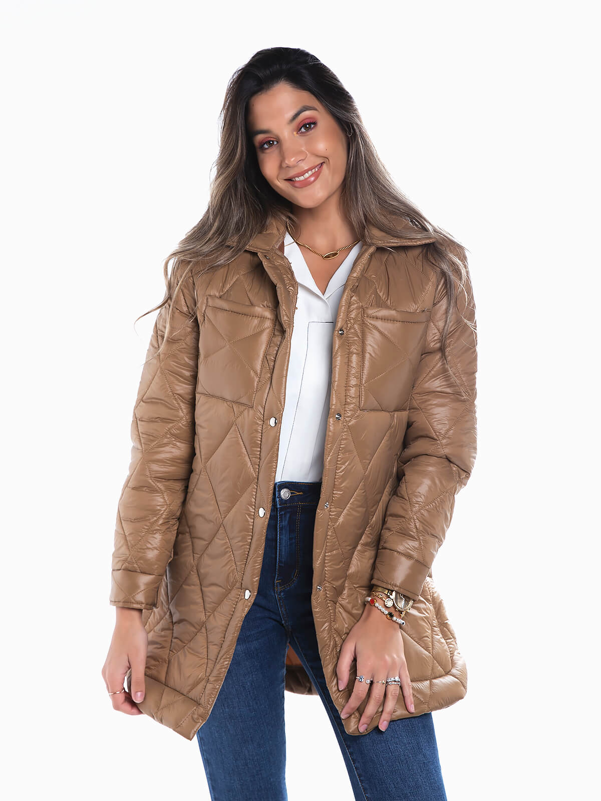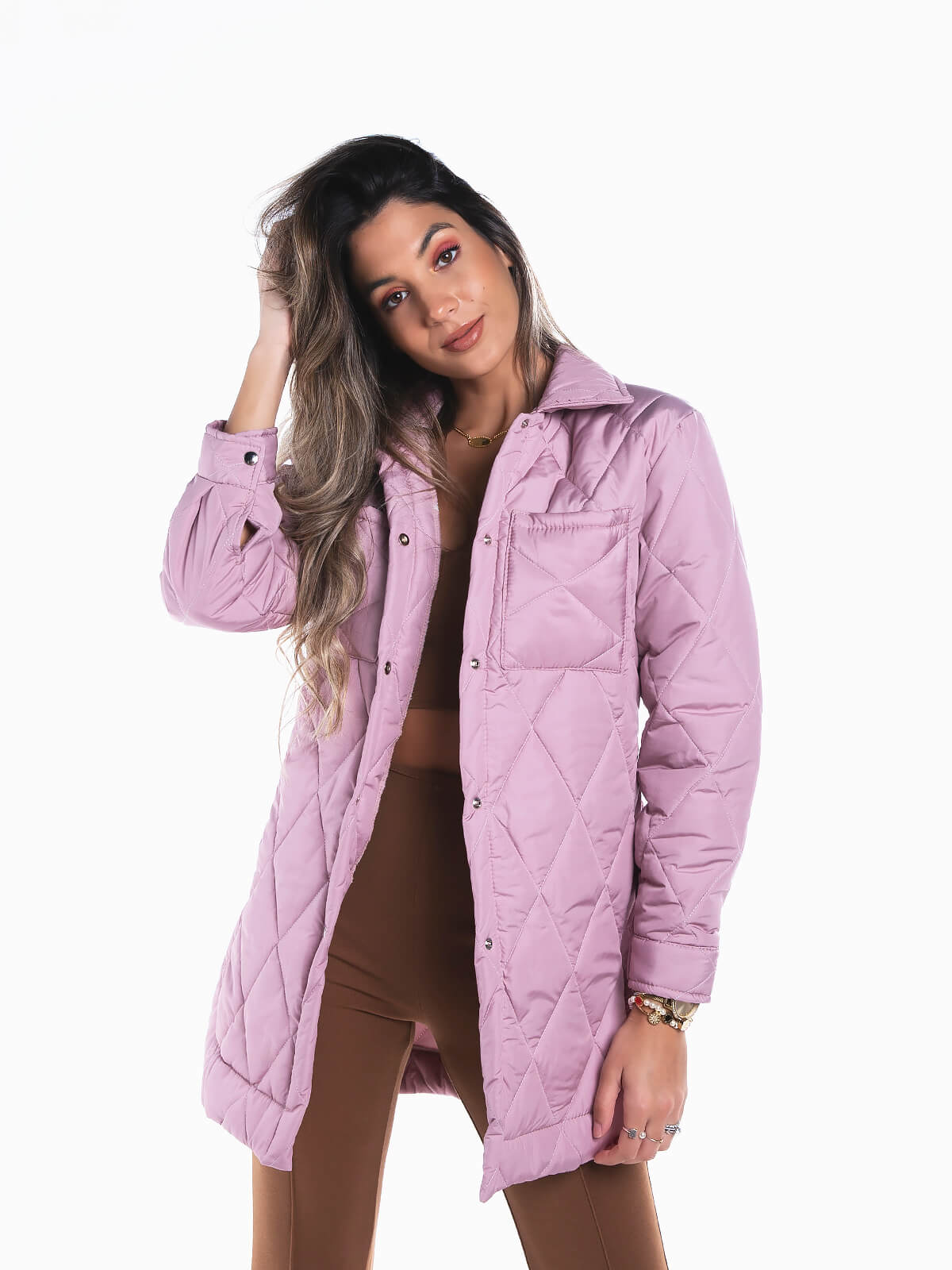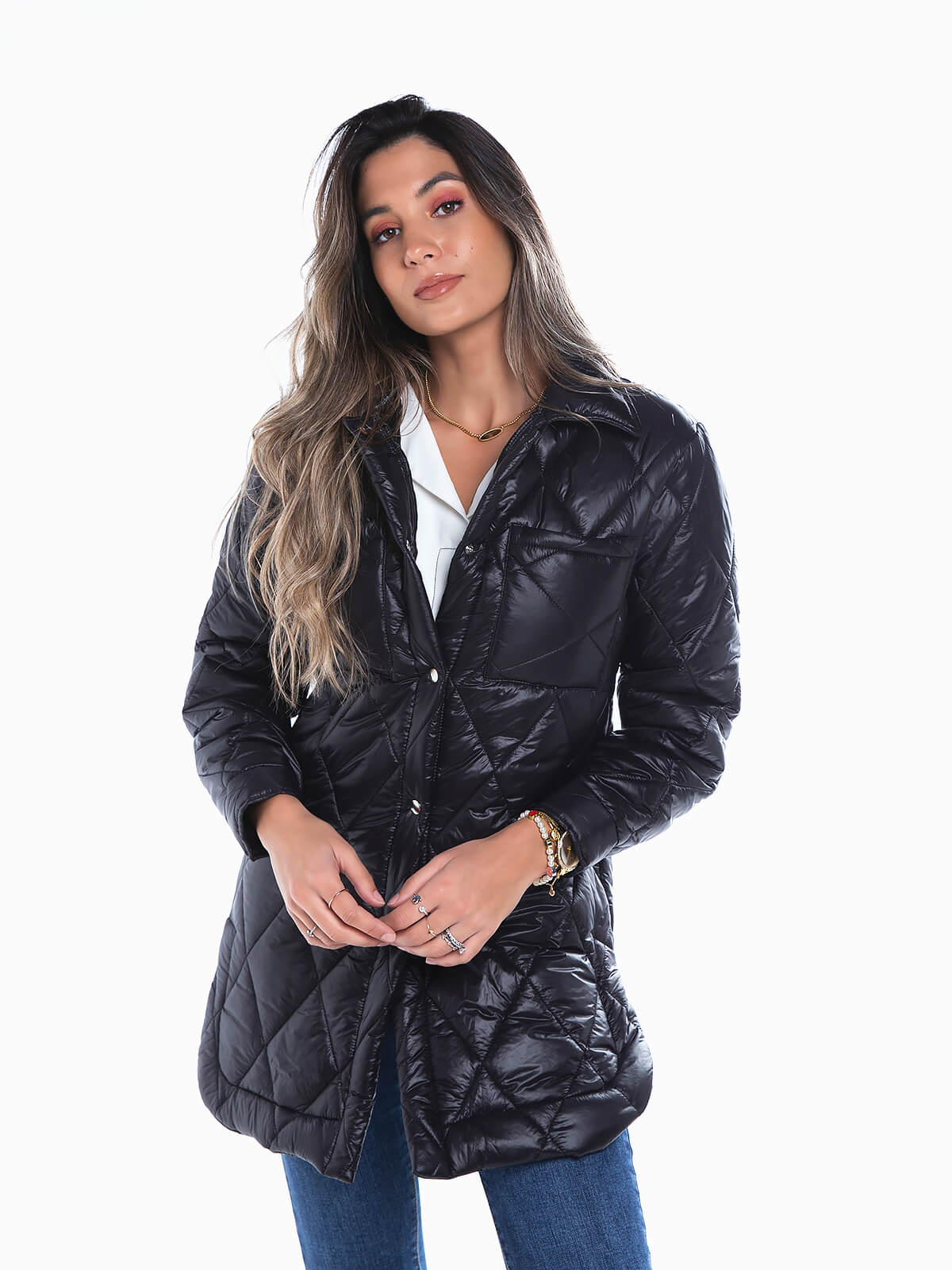 Blusão comprido acolchoado em losangos. Aberturas laterais. Tecido ligeiramente brilhante. Bolso no peito. Manga comprida. Aperto de molas.
