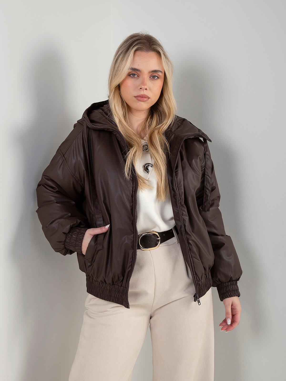 Casaco acolchoado para senhora, com capuz ajustável e fecho de correr frontal. Modelo oversized com elástico na cintura e nos punhos para um ajuste confortável. Confeccionado em material sintético de toque macio, ideal para os dias frios. Um essencial prático e atual para looks urbanos de inverno.