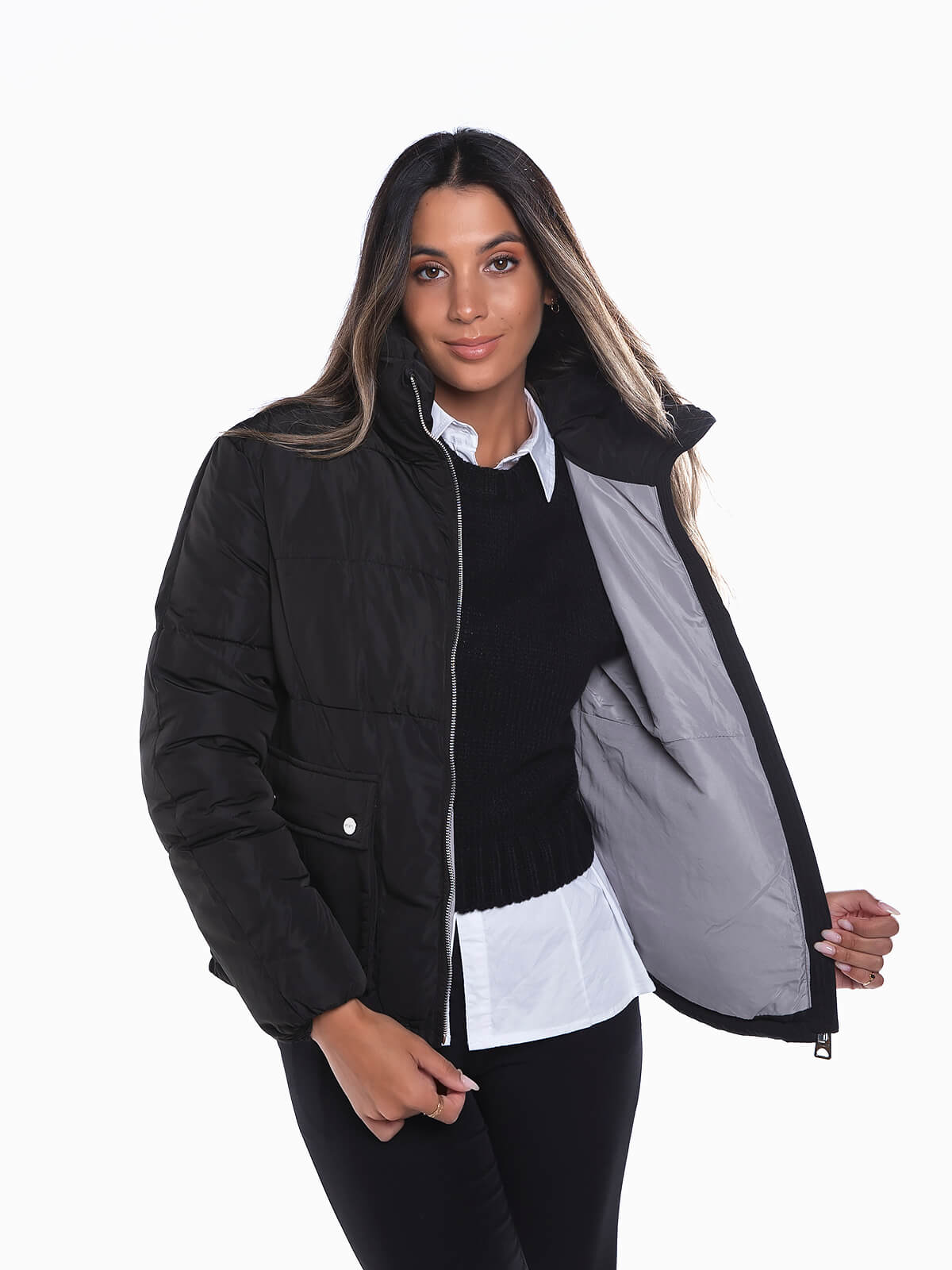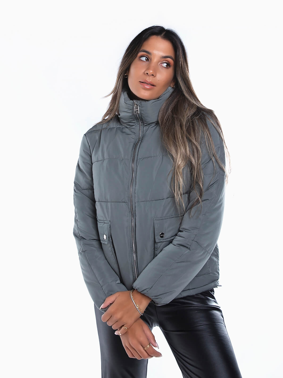 Blusão acolchoado com gola alta para senhora. Blusão impermeável com punhos elásticos. Cós com elástico para ajustar.