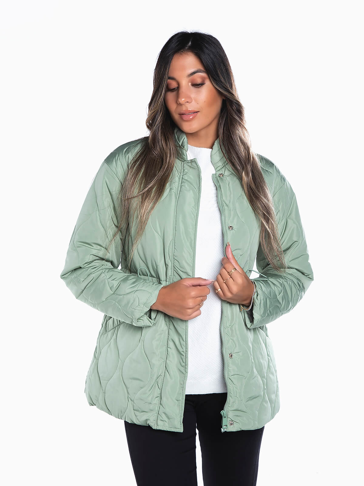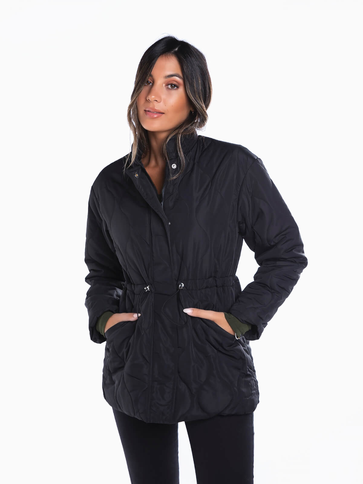 Blusão acolchoado cintado com gola subida. Blusão para senhora de manga comprida. 2 bolsos em viés. Cintura com elástico para ajustar. Forrado. Aperto de fecho éclair e botões de pressão.