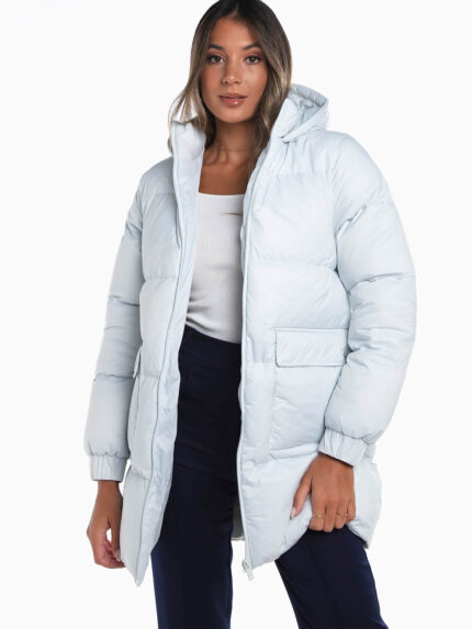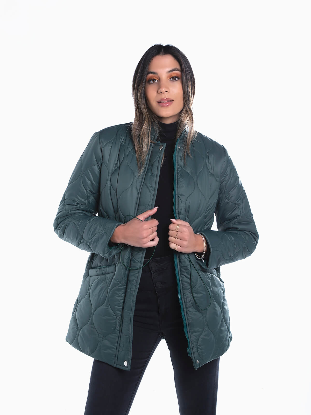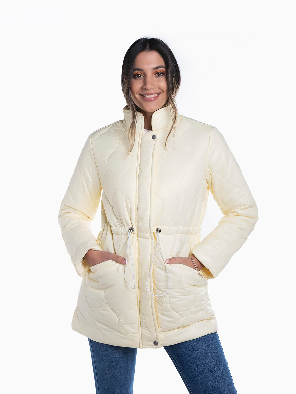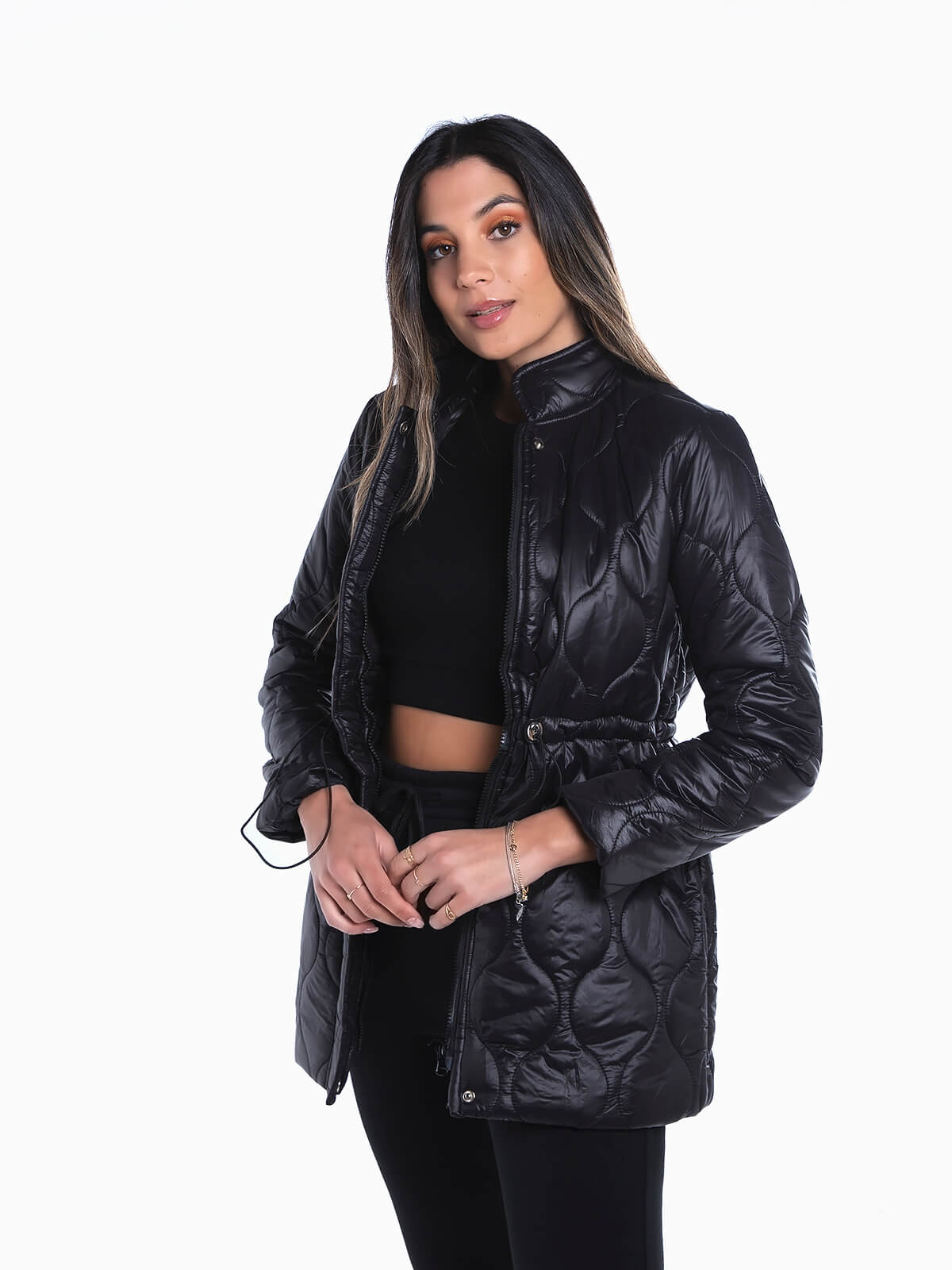 Blusão acolchoado impermeável com elástico na cintura para ajustar. Blusão de manga comprida com dois bolsos em viés. Gola subida. Aperto de fecho éclair e botões de pressão.