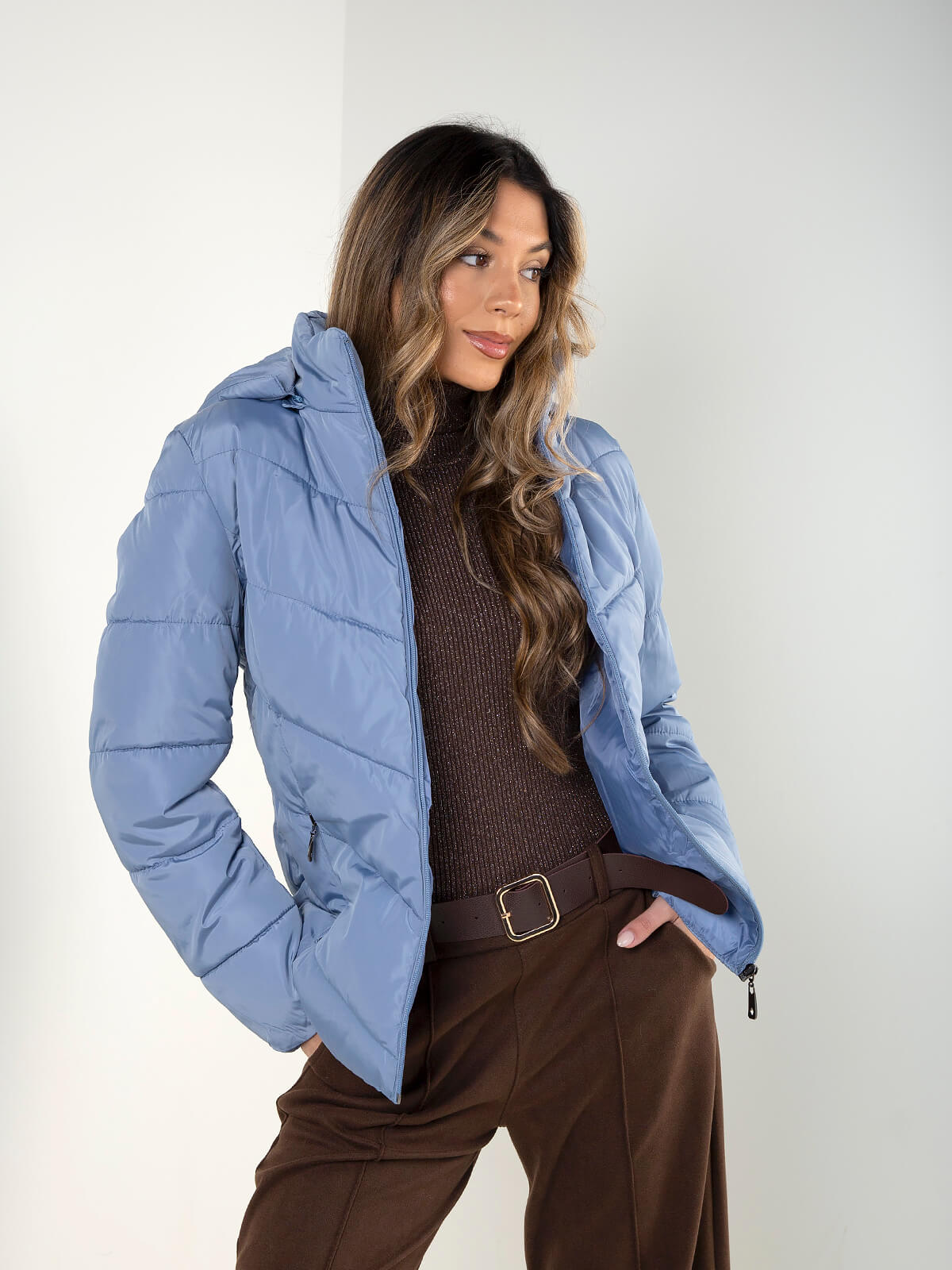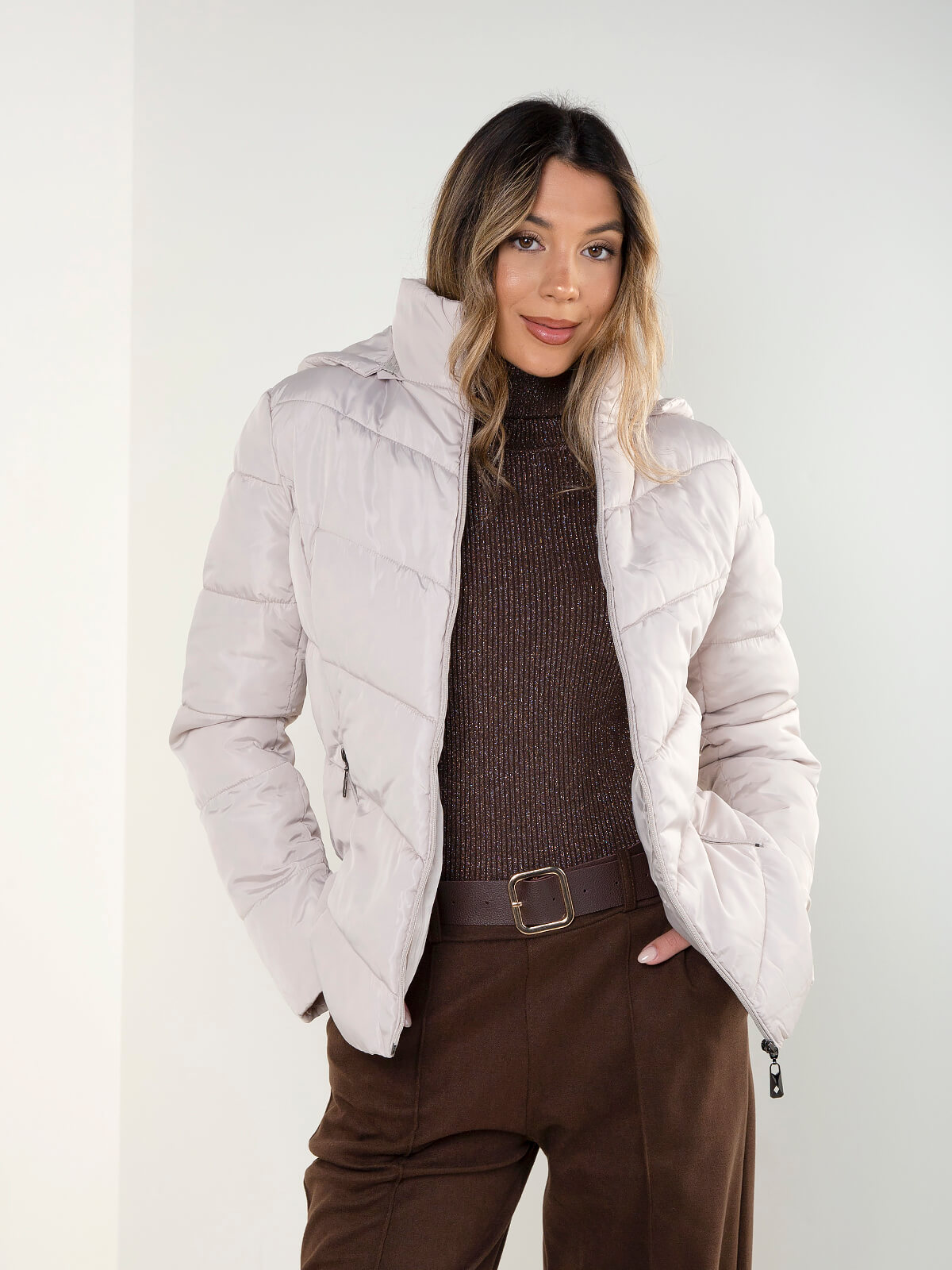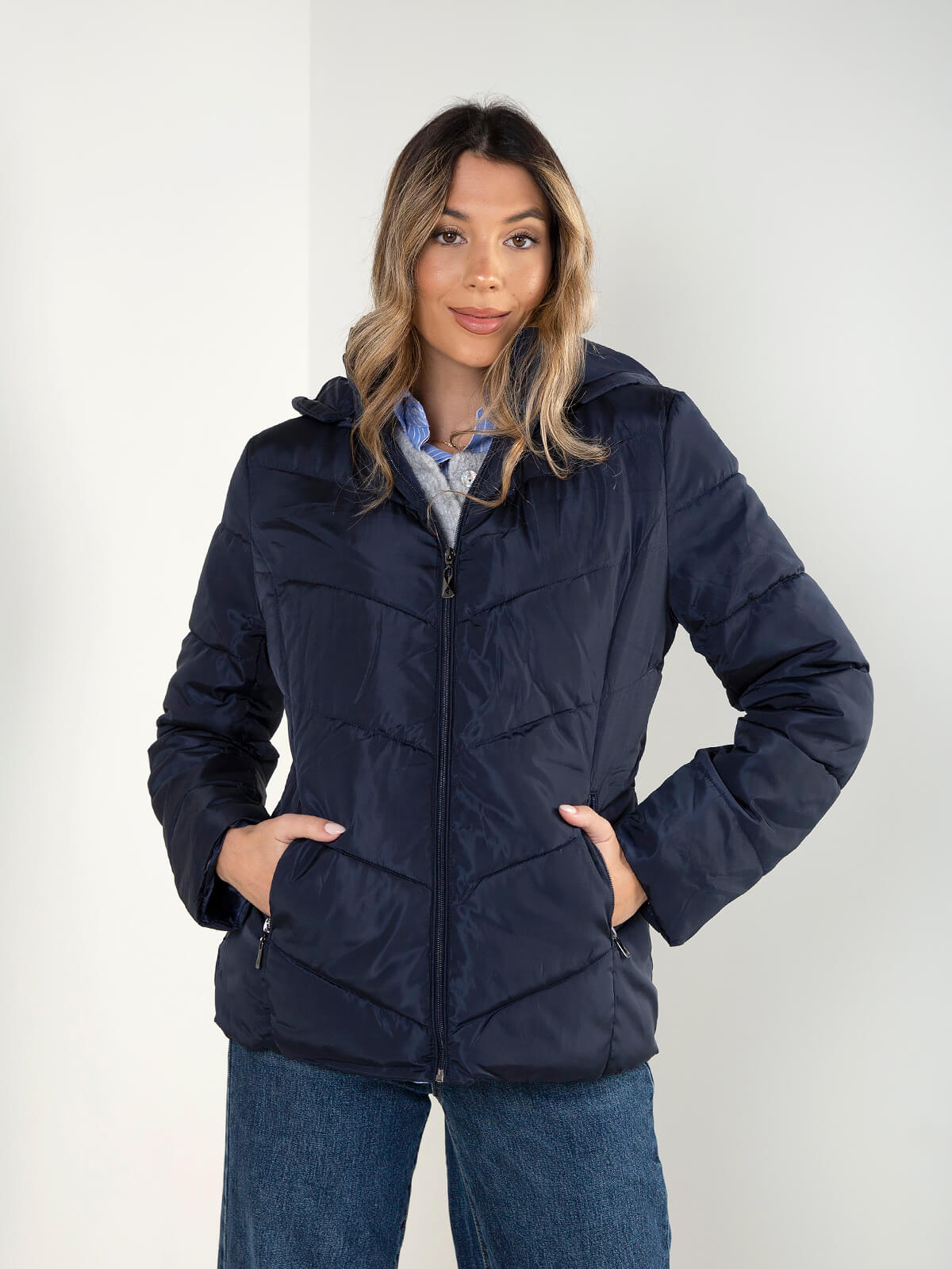 Casaco acolchoado impermeável para mulher, leve e quente, com capuz removível e dois bolsos com fecho. Modelo confortável para o dia a dia, perfeito para chuva e frio.