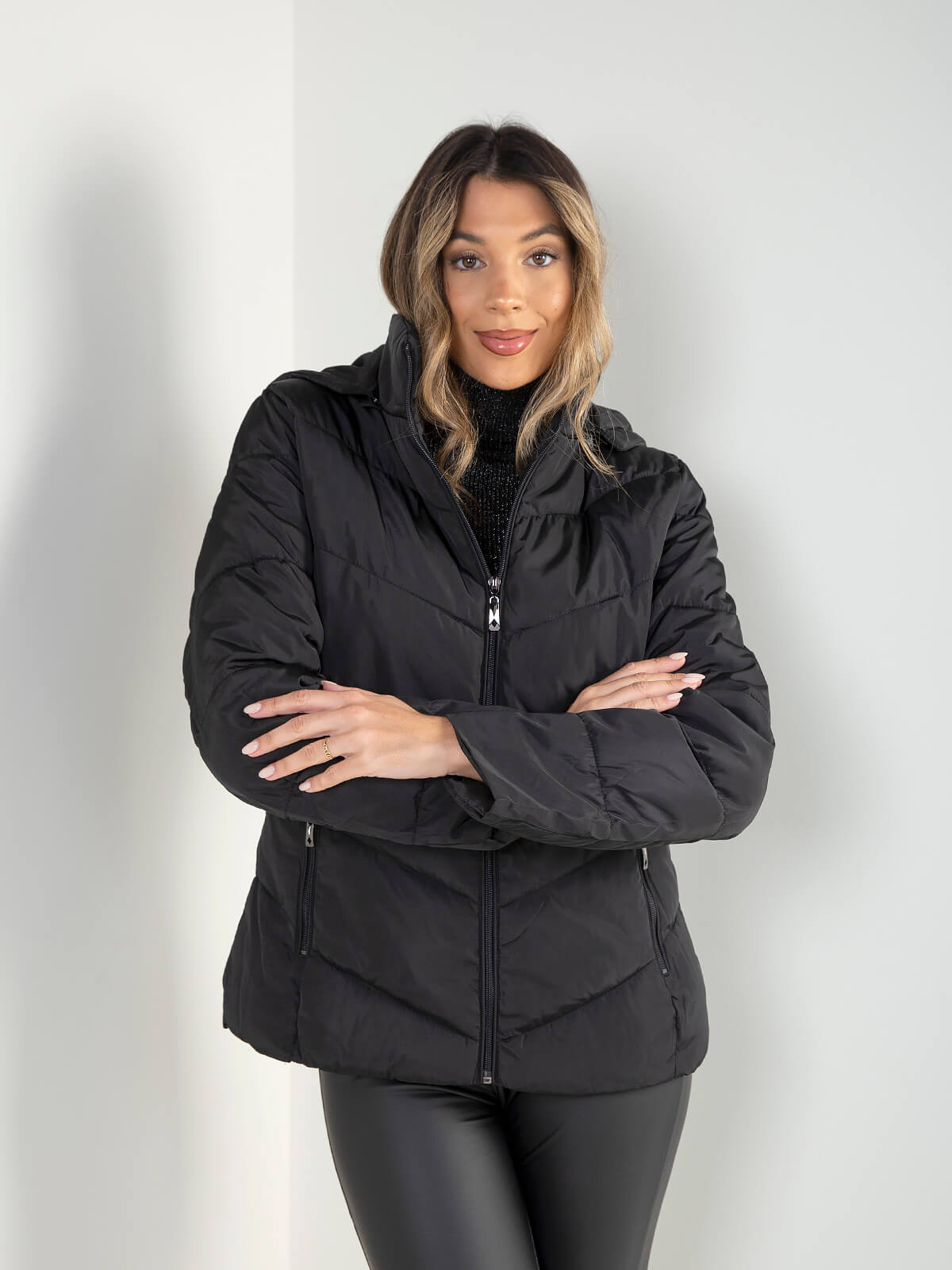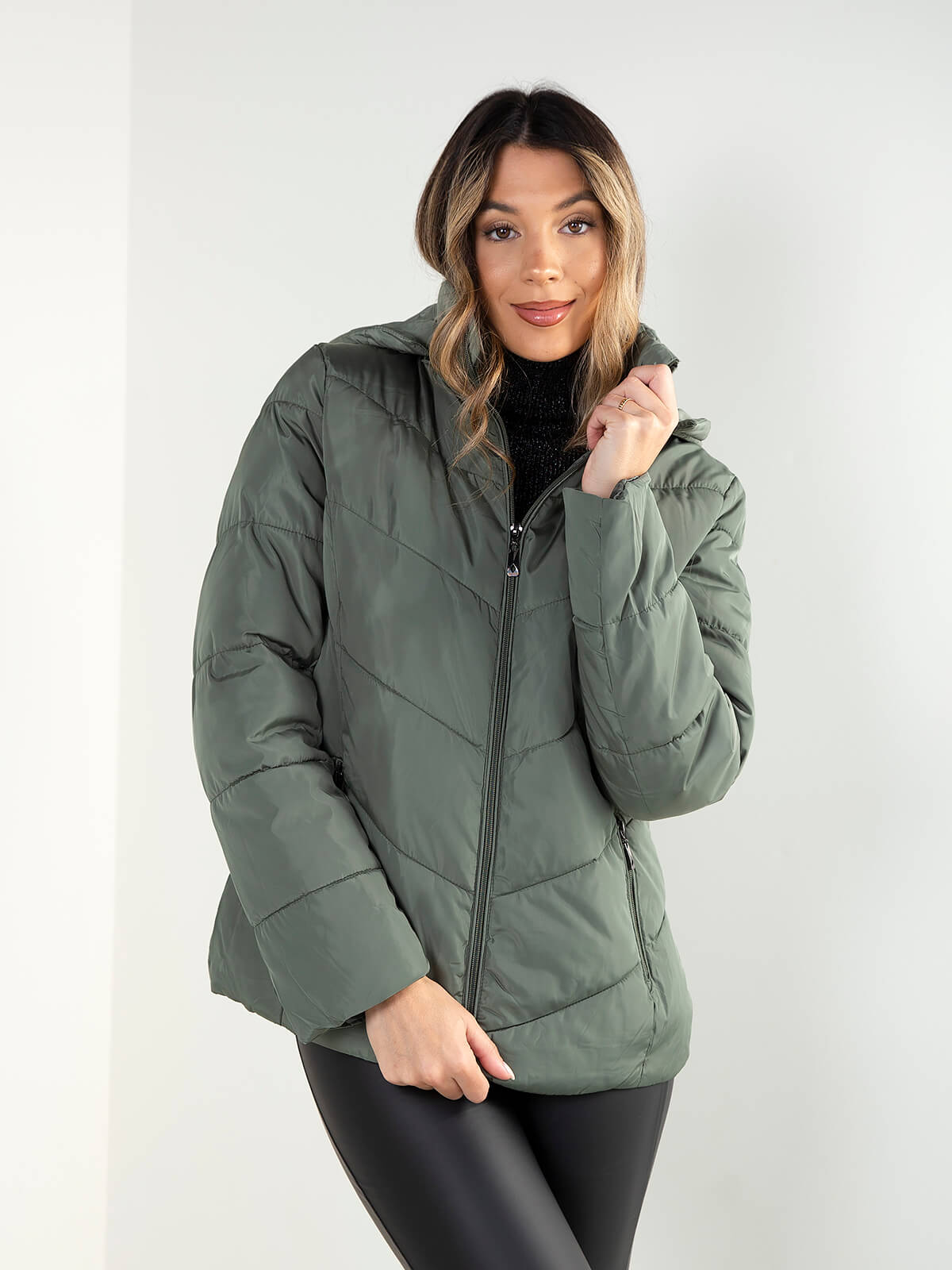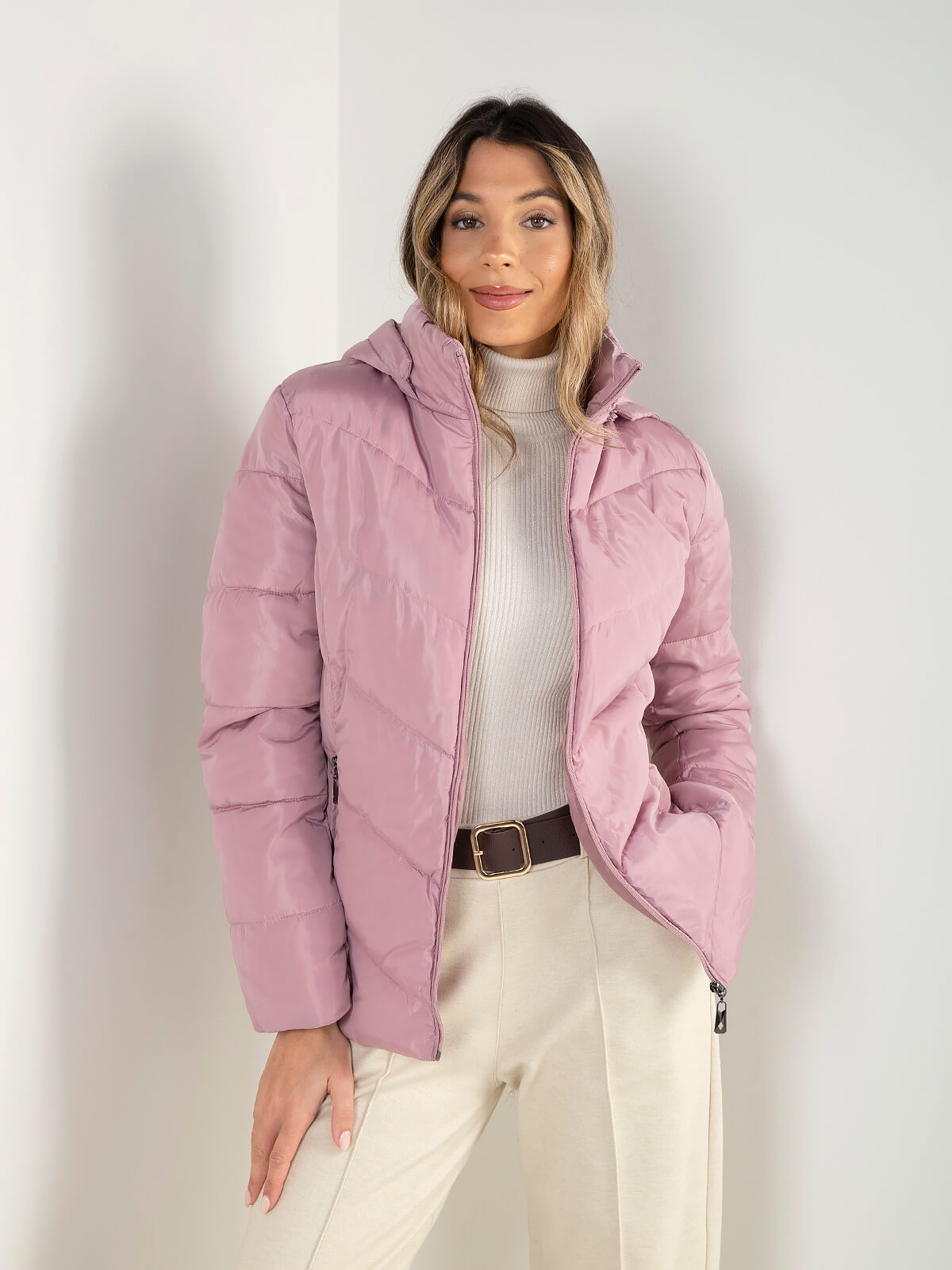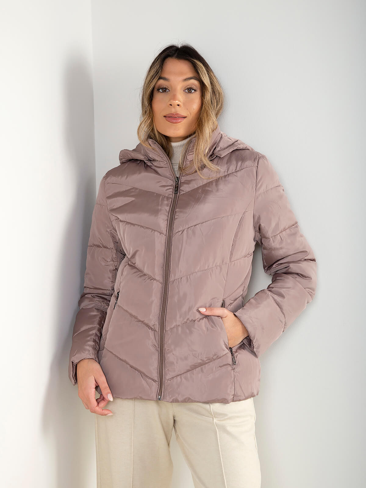 Casaco acolchoado impermeável para mulher, leve e quente, com capuz removível e dois bolsos com fecho. Modelo confortável para o dia a dia, perfeito para chuva e frio.