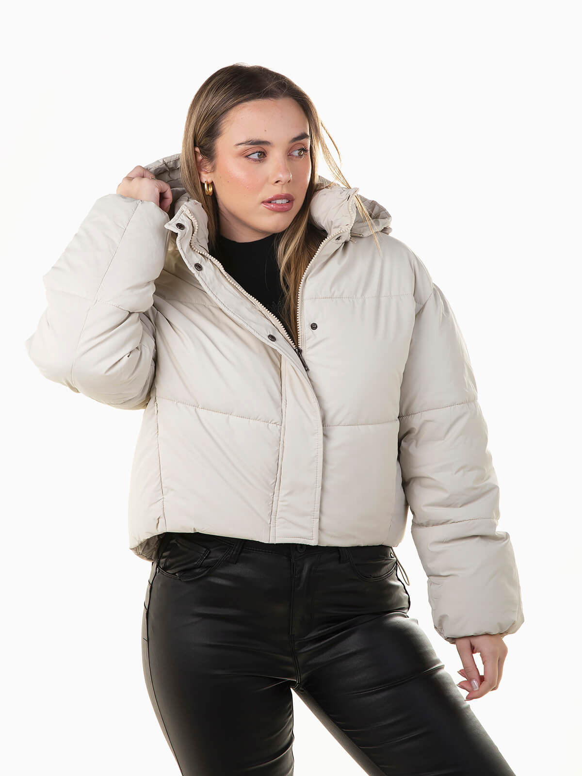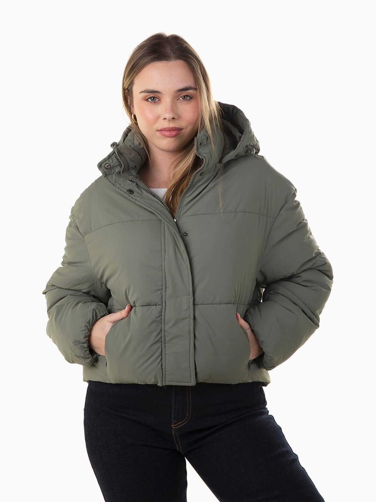 Blusão acolchoado impermeável com capuz removível para mulher. Blusão oversize manga comprida com gola alta e dois bolsos. Aperto de fecho zíper e botões pressão.