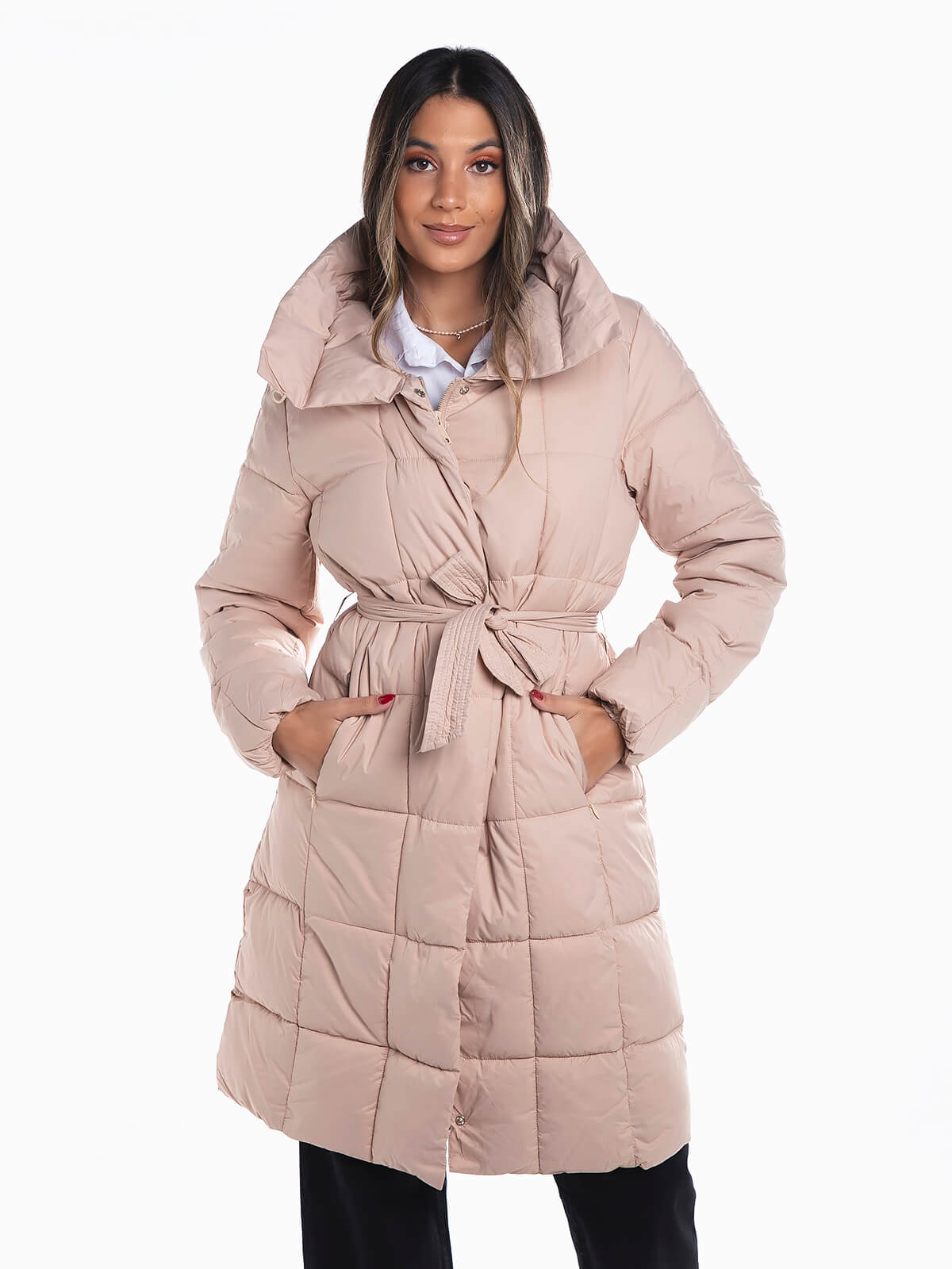 Blusão acolchoado impermeável com cinto removível. Blusão de manga comprida com gola alta. 2 bolsos. Aperto de fecho zíper e botões.