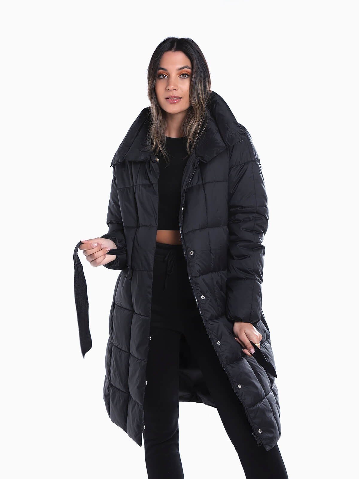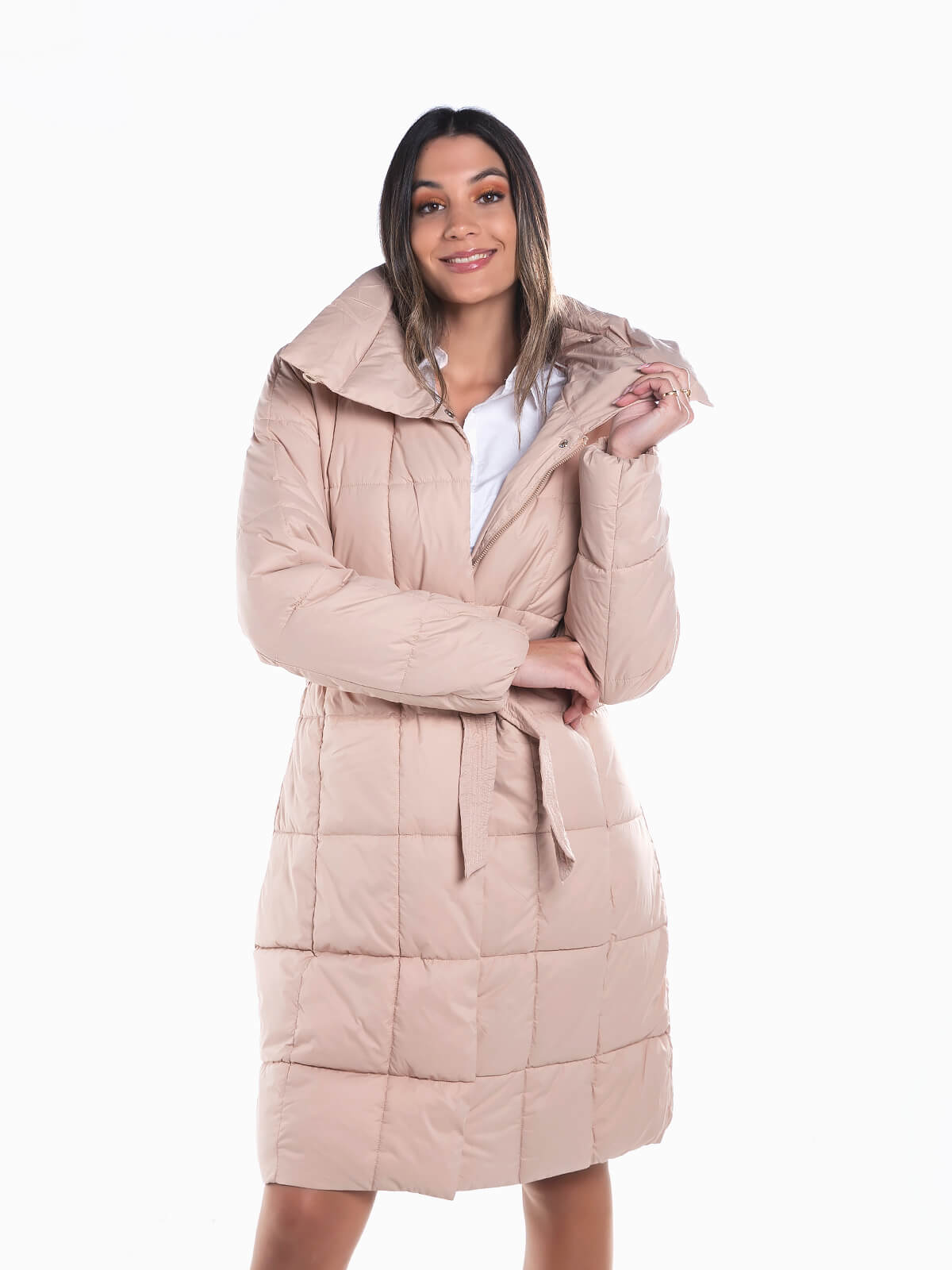 Blusão acolchoado impermeável com cinto removível. Blusão de manga comprida com gola alta. 2 bolsos. Aperto de fecho zíper e botões.