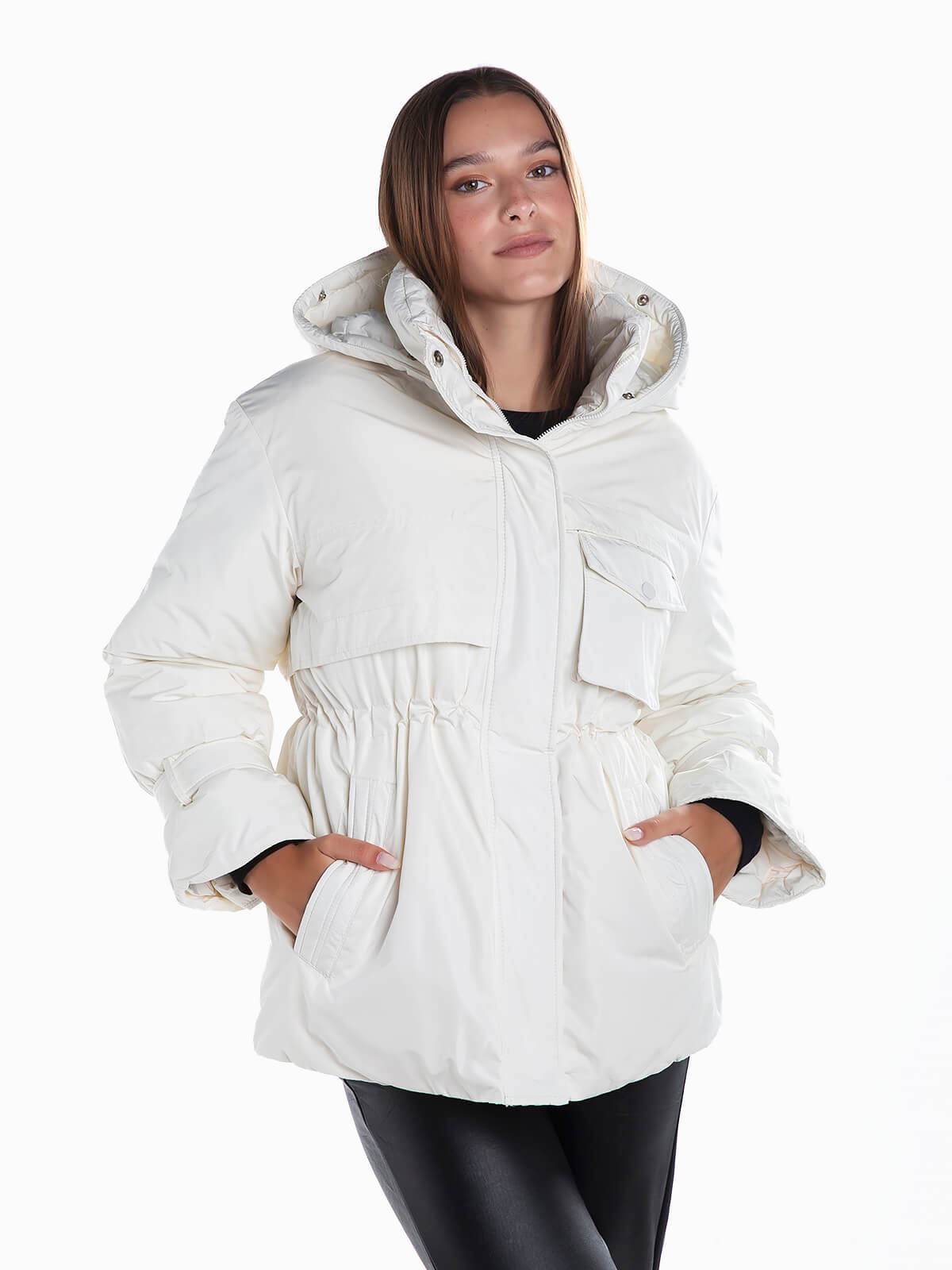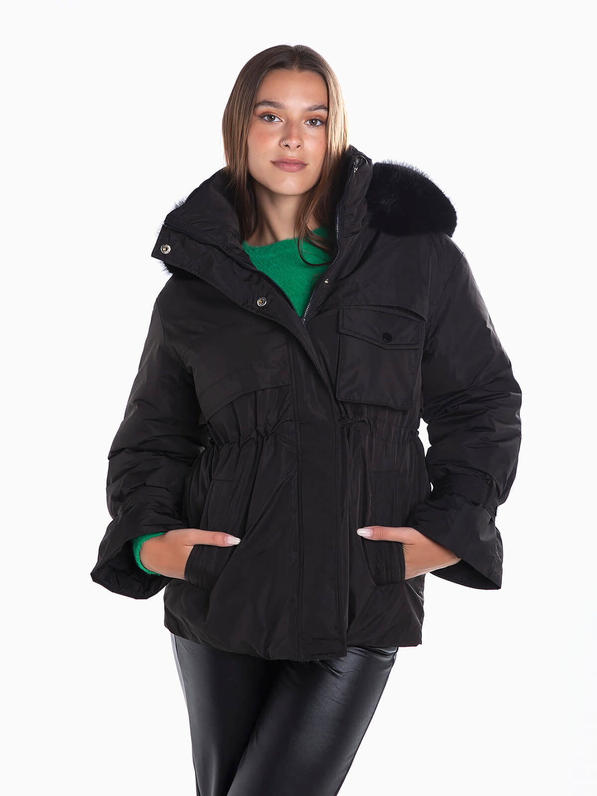 Blusão acolchoado impermeável com pelo removível no capuz. Blusão com elástico na cintura para ajustar.