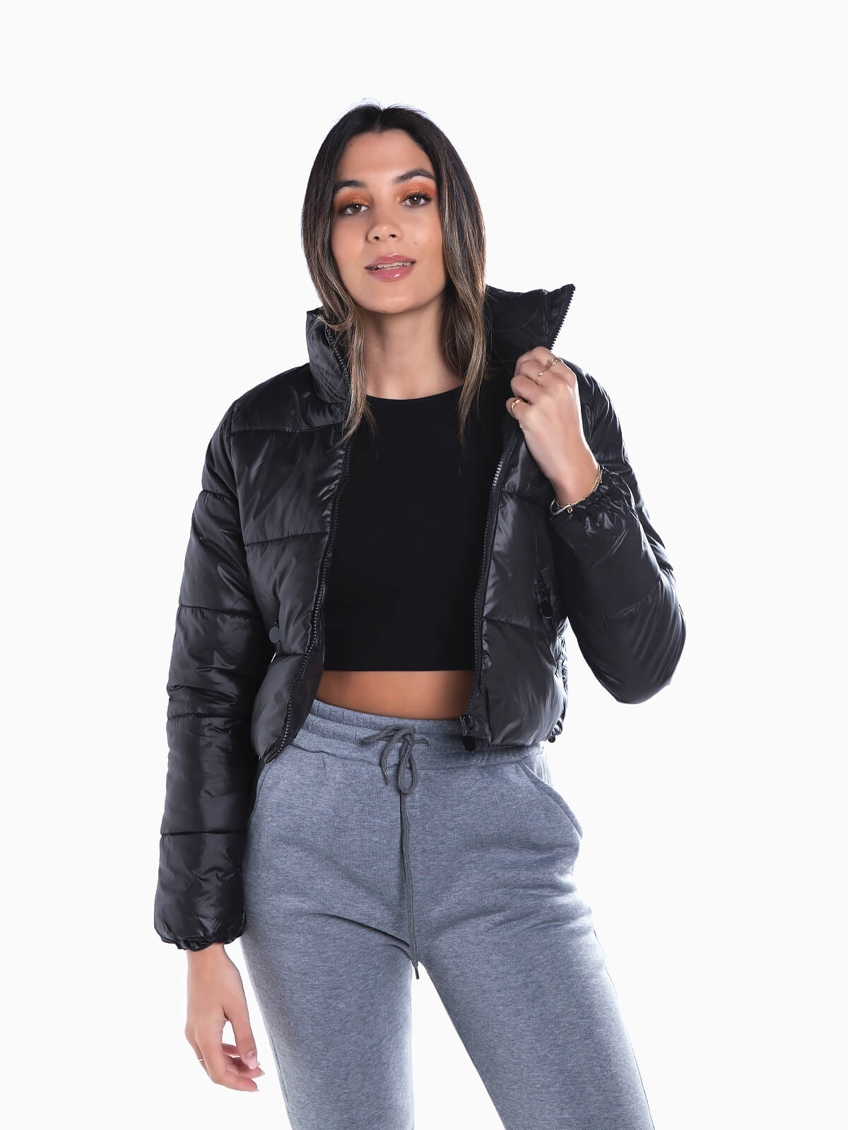 Blusão acolchoado impermeável de gola alta para senhora. Blusão manga comprida com dois bolsos. Cós com elástico para ajustar. Aperto de fecho éclair.