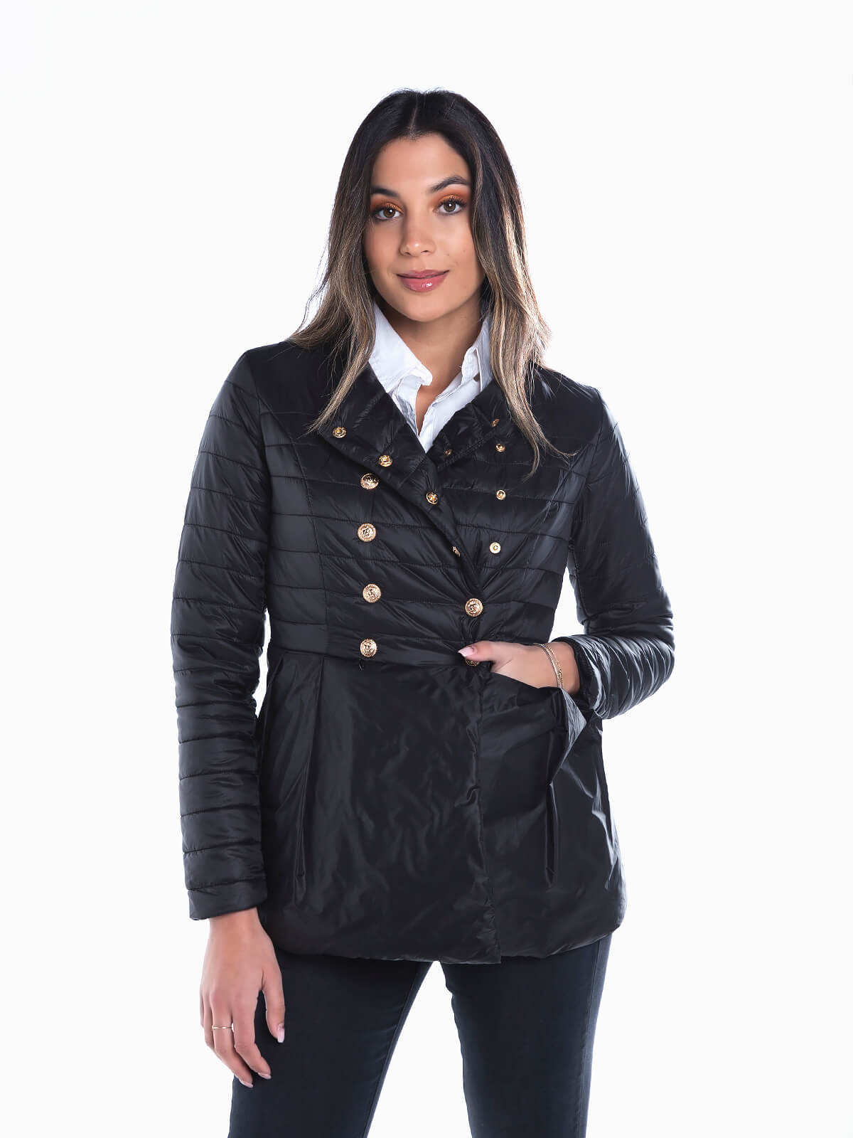 Blusão acolchoado leve com aperto de botões de pressão dourados. Blusão impermeável de manga comprida com encaixe de folho. 2 bolsos com fecho oculto na costura.