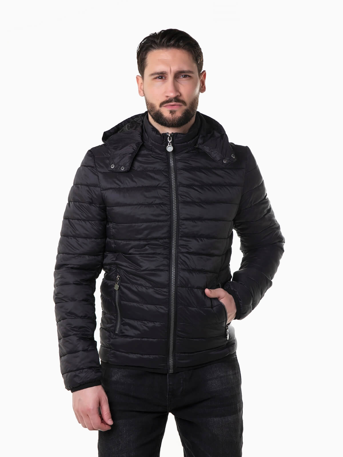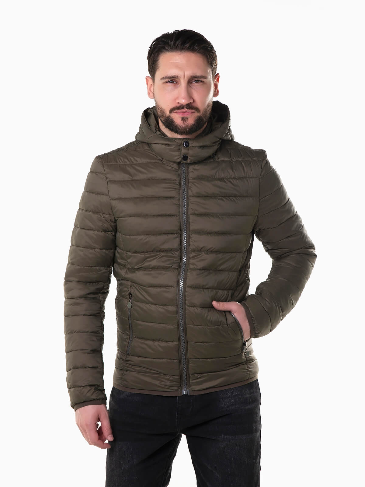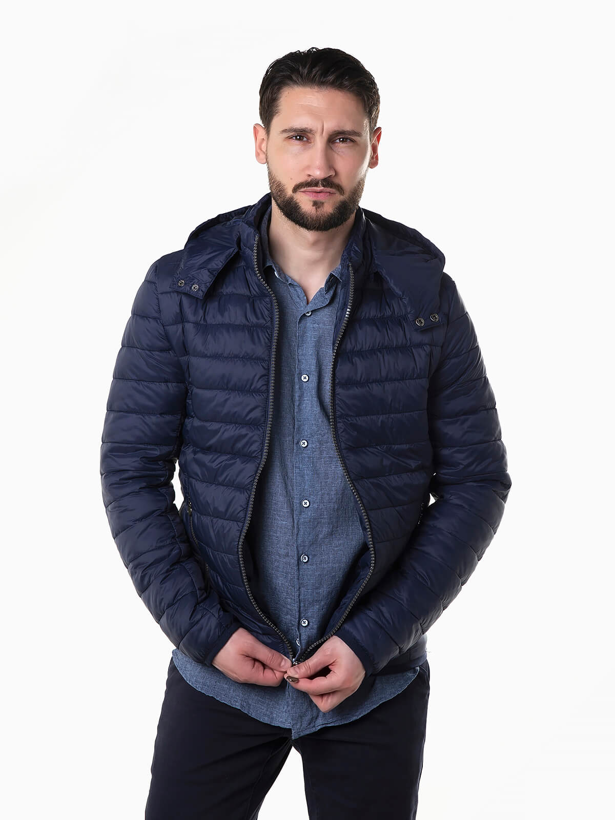 Blusão acolchoado leve com capuz removível para homem. Blusão impermeável com dois bolsos laterias e um interior. Manga comprida. Aperto de fecho zíper.