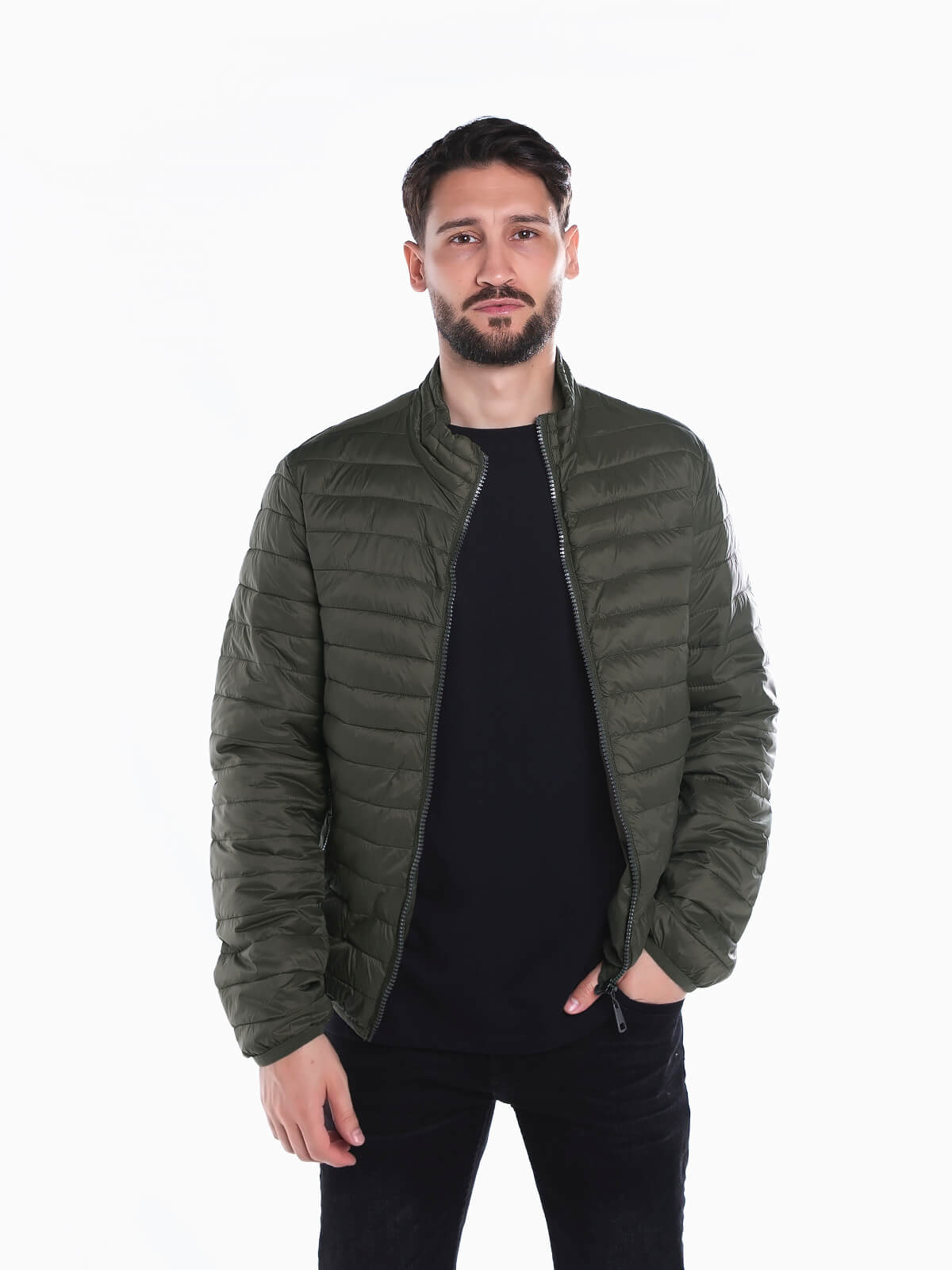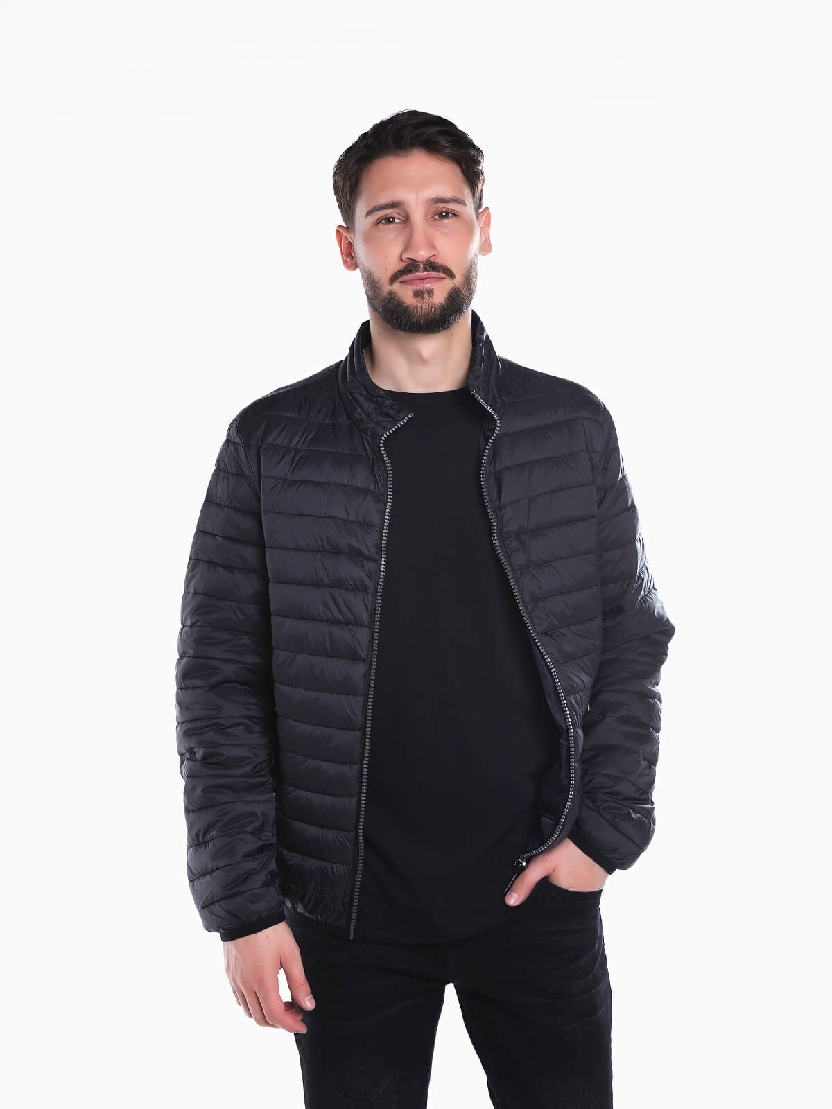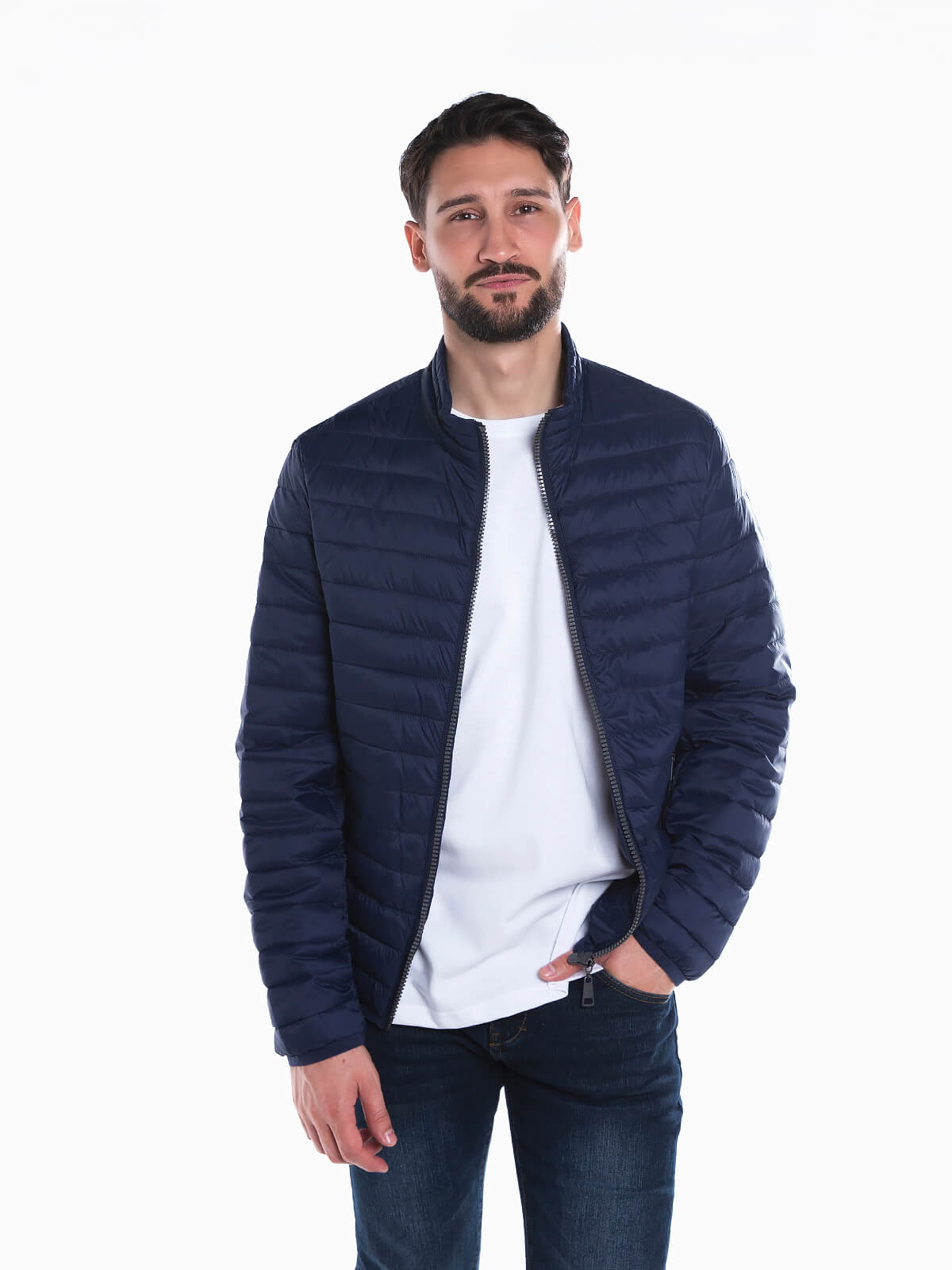 Blusão acolchoado leve para homem. Blusão impermeável com gola subida e bolso interior. Manga comprida. 2 bolsos laterais. Acabamentos elásticos. Aperto de fecho zíper.