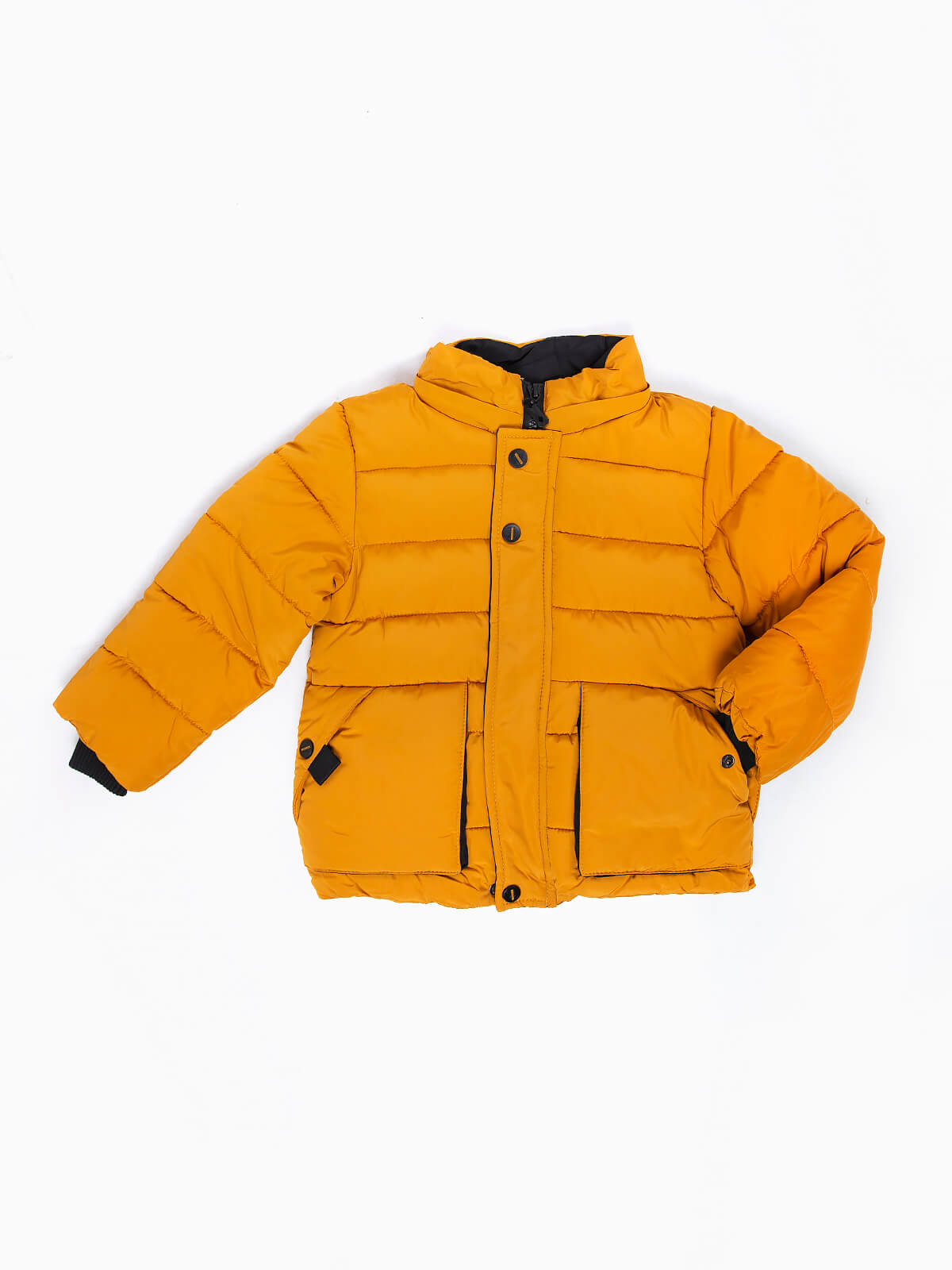 Blusão acolchoado impermeável forrado com pelo para menino. Casaco com capuz forrado em tecido felpudo. Gola subida. Aperto com fecho zíper e aba com botões de pressão. Bolsos quadrados frontais com aperto botões de mola.