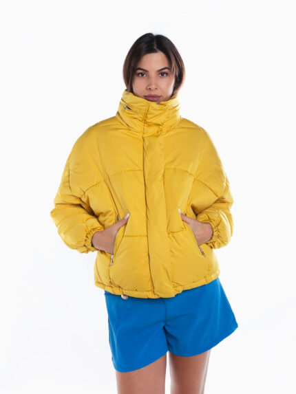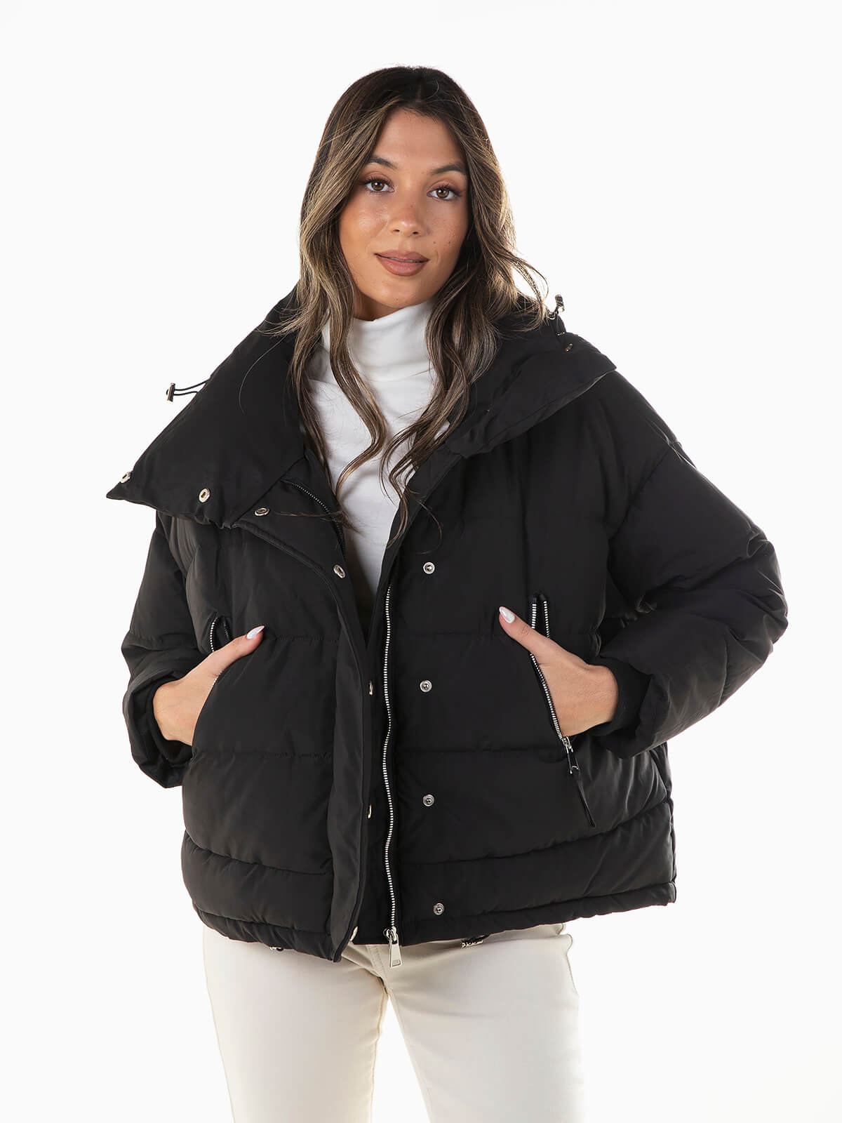 Blusão acolchoado oversized com gola alta ampla para mulher. Blusão de manga comprida com punhos elásticos e 2 bolsos laterais. Elástico na gola para ajustar. Aperto de fecho zíper e botões de pressão.