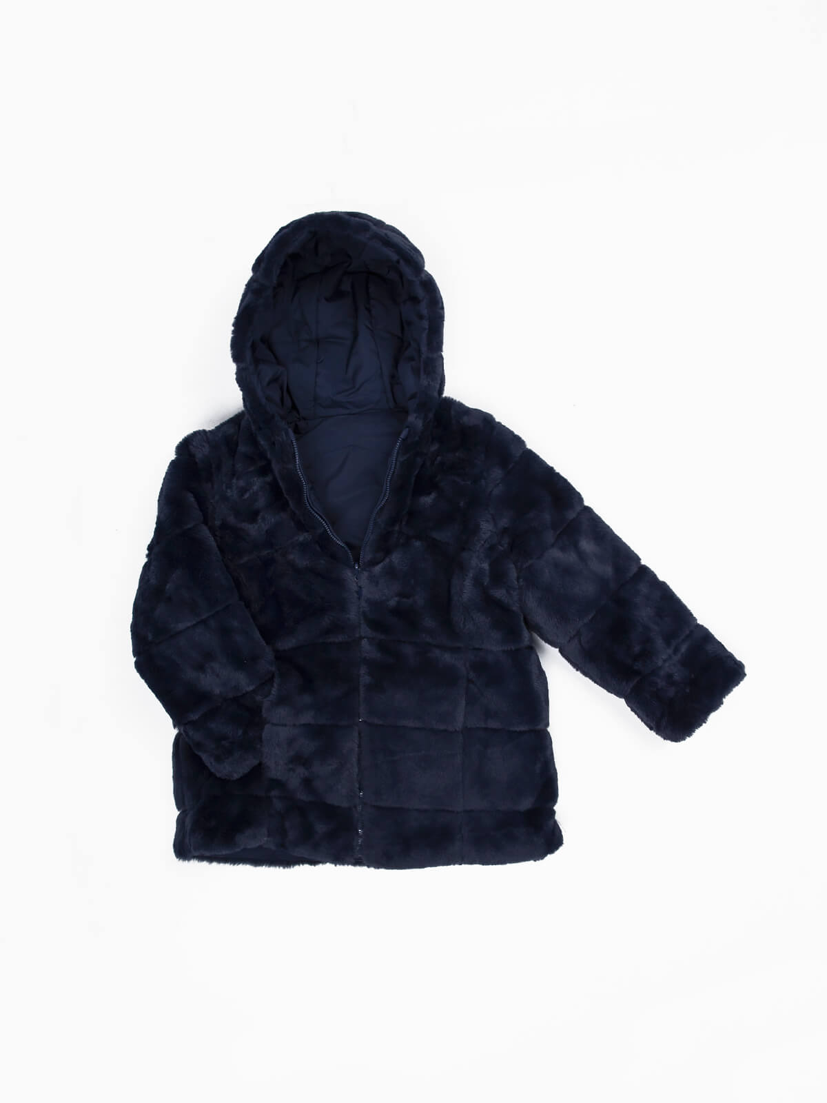 Blusão acolchoado reversível azul marinho para menina. Blusão com lado em pelo sintético. Capuz e gola subida. Manga comprida. 2 bolsos. Aperto de fecho éclair.