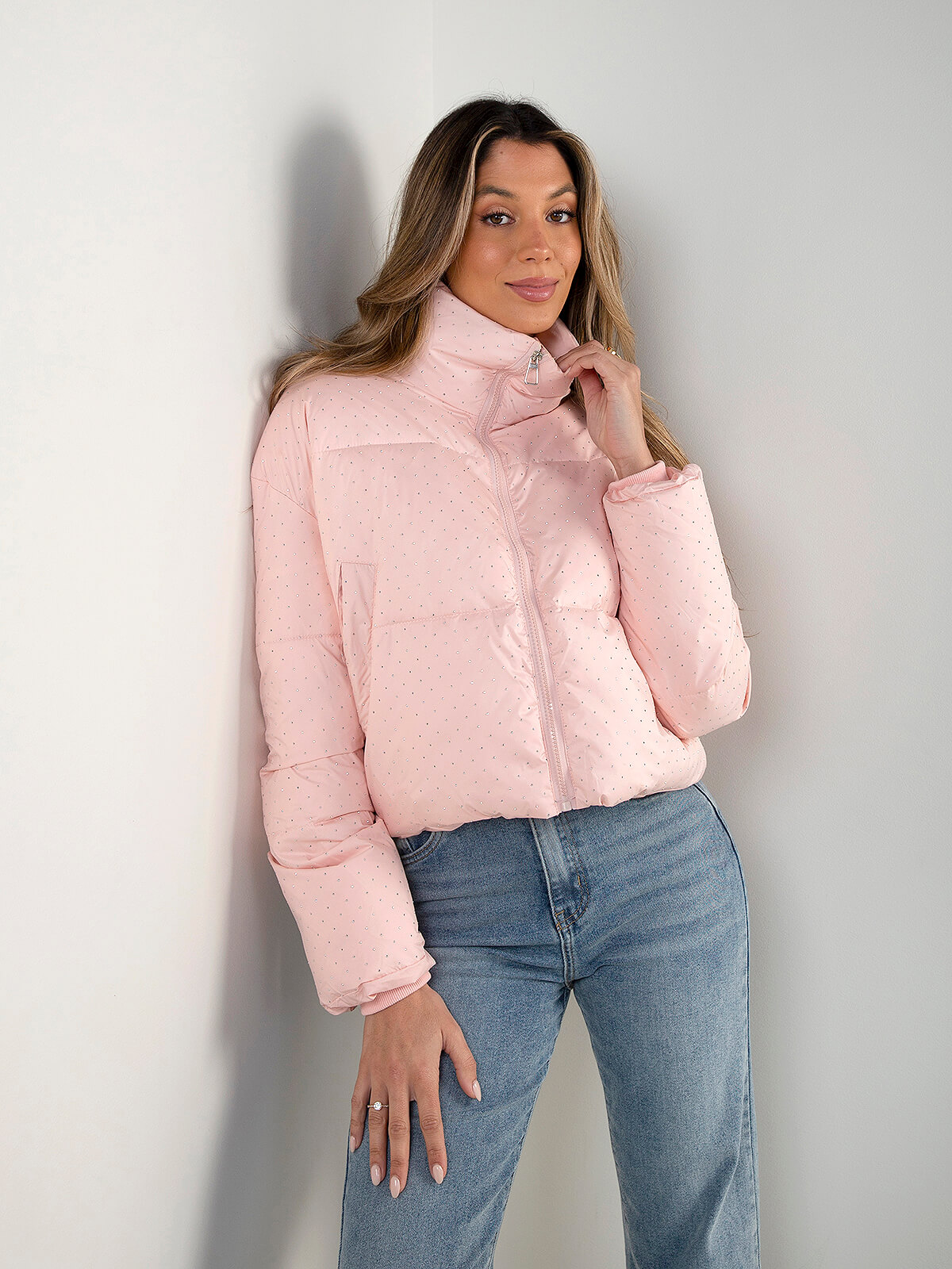 Blusão acolchoado rosa bebé com strass aplicado para efeito brilhante. Blusão oversize com gola alta e punhos em malha. Elástico na base para ajustar. 2 bolsos. Aperto fecho zíper.