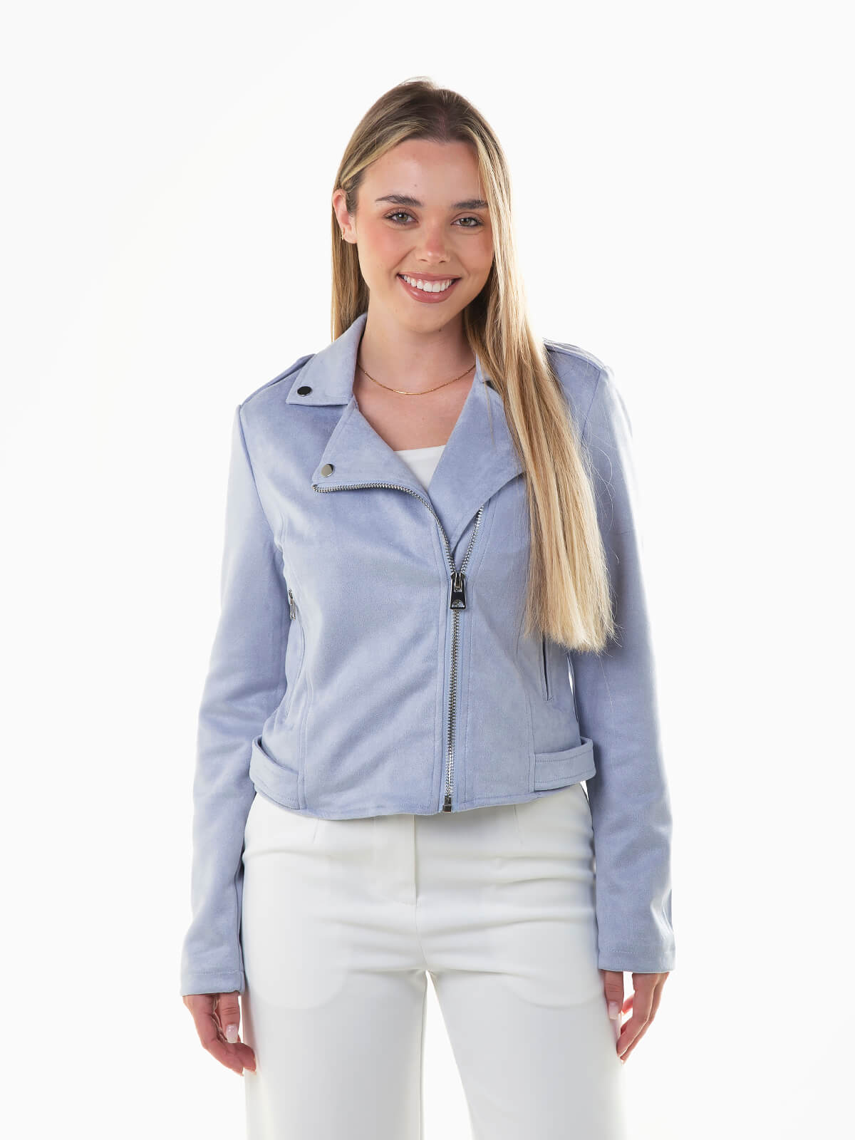 Blusão biker azul com efeito camurça para mulher. Casaco manga comprida com interior forrado e fivelas nas laterais. Gola de abas. 2 bolsos. Fecho éclair em viés.