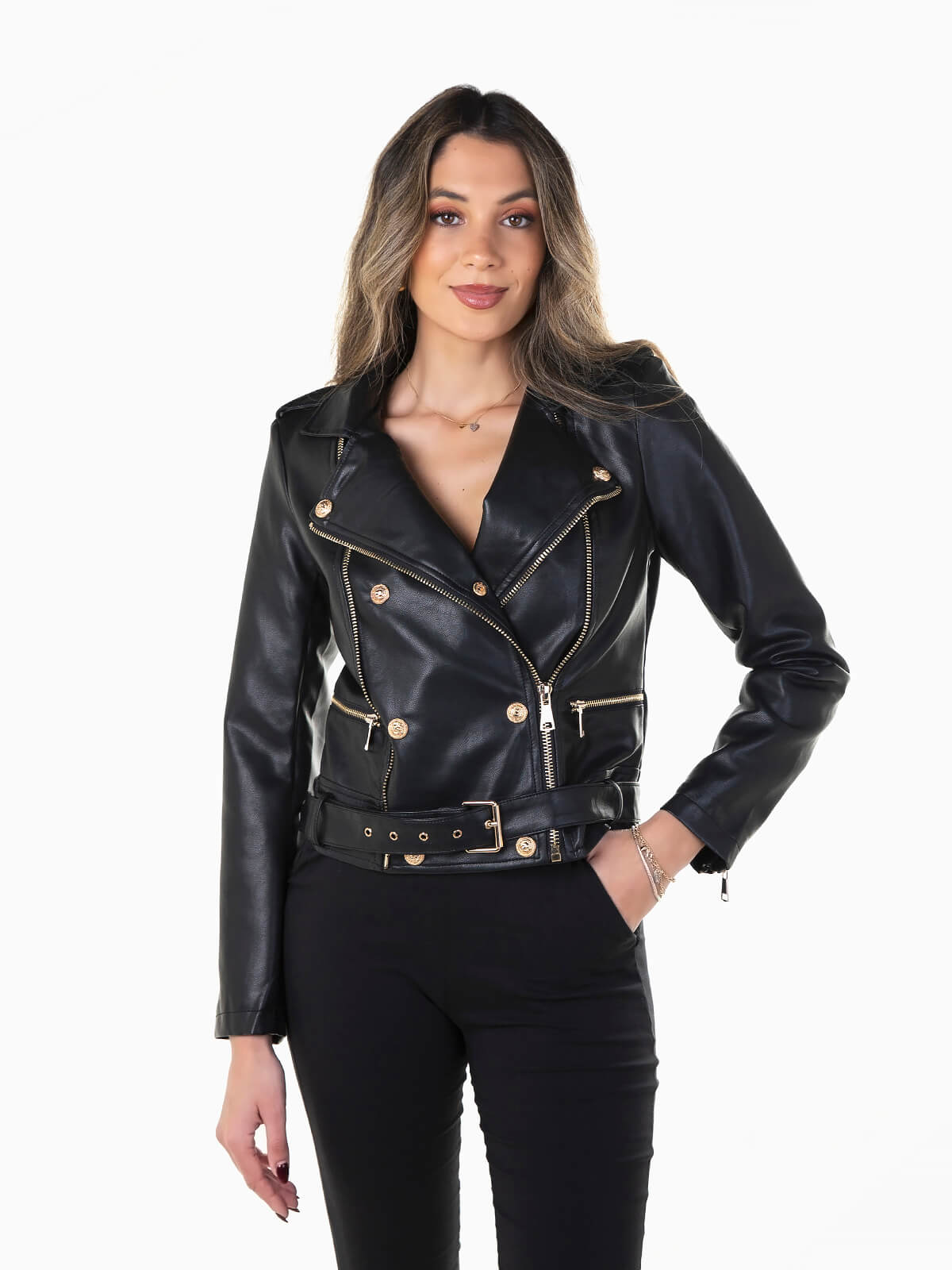 Blusão biker efeito pele com botões dourados aplicados. Blusão manga comprida com interior forrado e fechos decorativos. Gola abas e lapelas. Cinto na base para ajustar. 2 bolsos. Aperto de fecho zíper.