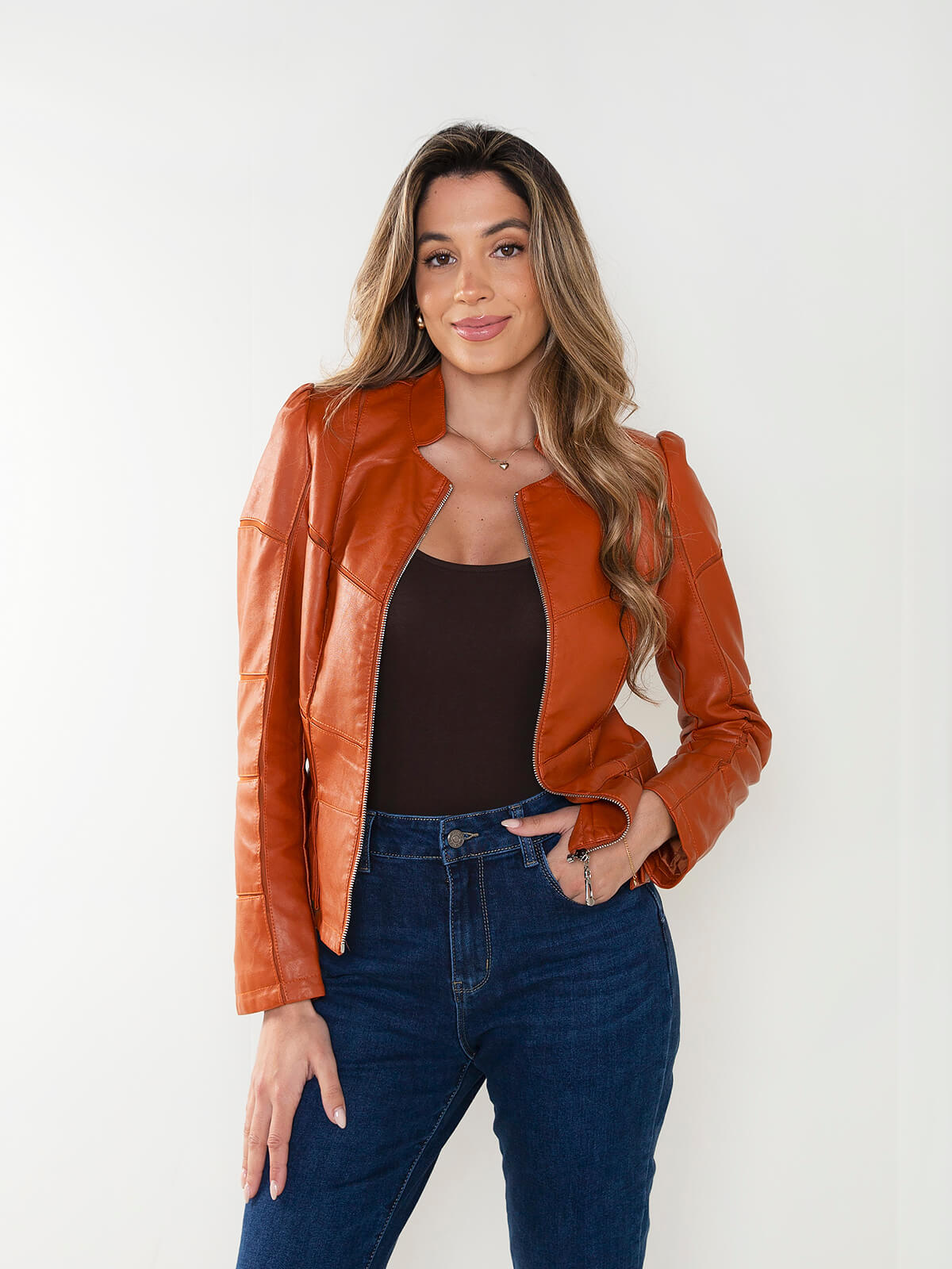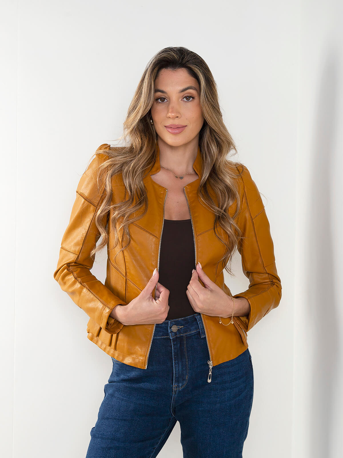 Blusão biker de efeito pele com design estruturado e fecho frontal de correr. Modelo de inspiração urbana, ideal para looks do dia a dia ou para dar um toque moderno a produções mais clássicas. Uma peça versátil e intemporal para a meia-estação.