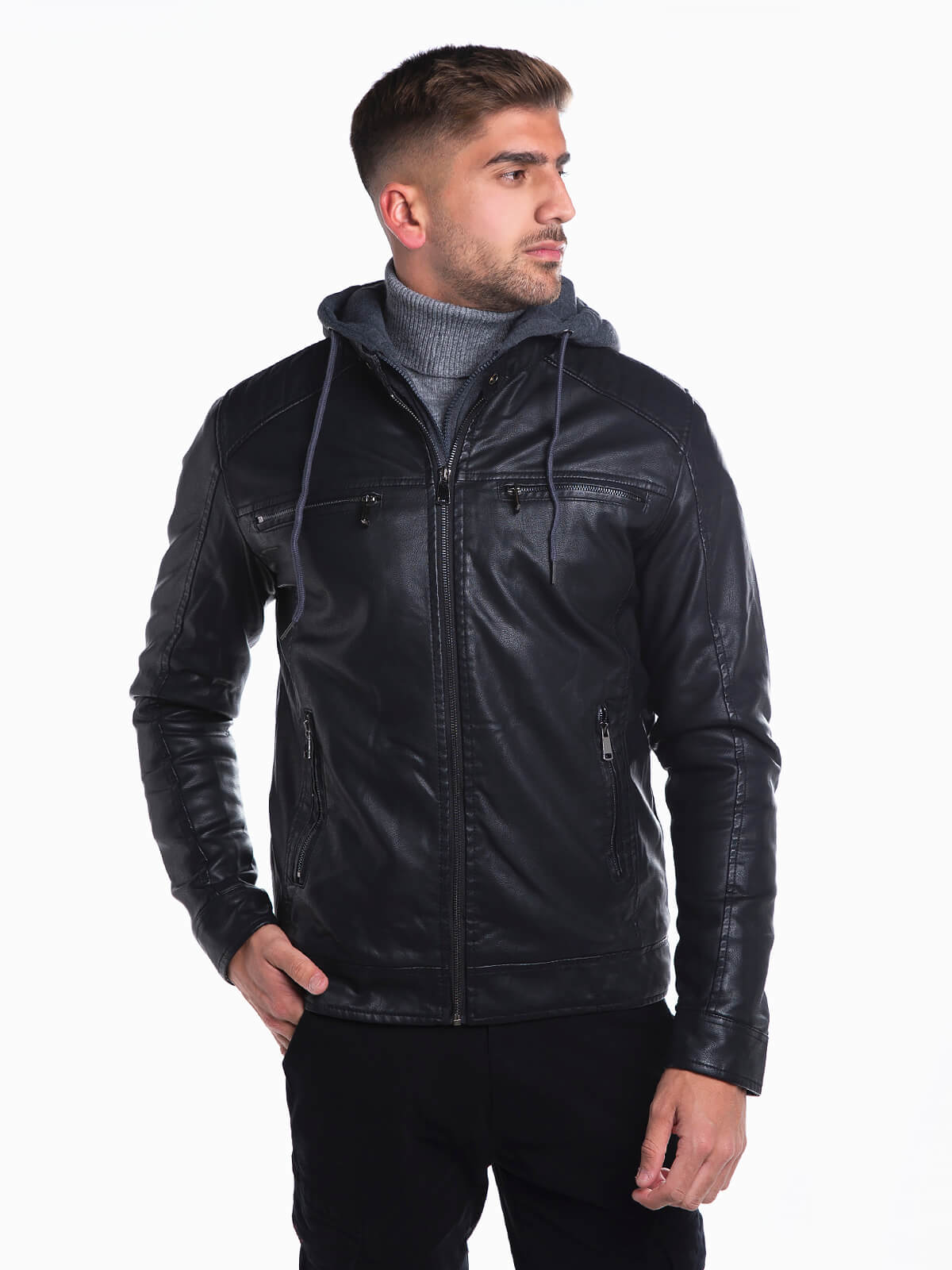 Blusão biker combinado com felpa removível no capuz e fecho. Blusão efeito pele com interior em pelo para maior conforto térmico. 2 bolsos e 1 interior. Gola e punhos abotoados. Aperto de fecho zíper.
