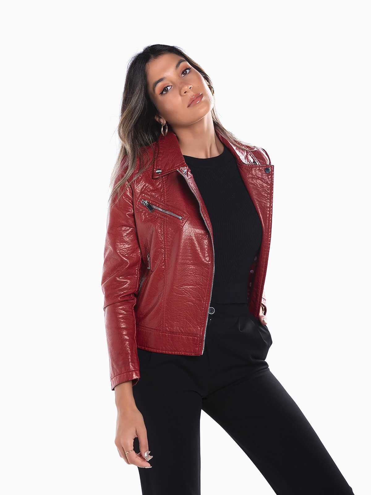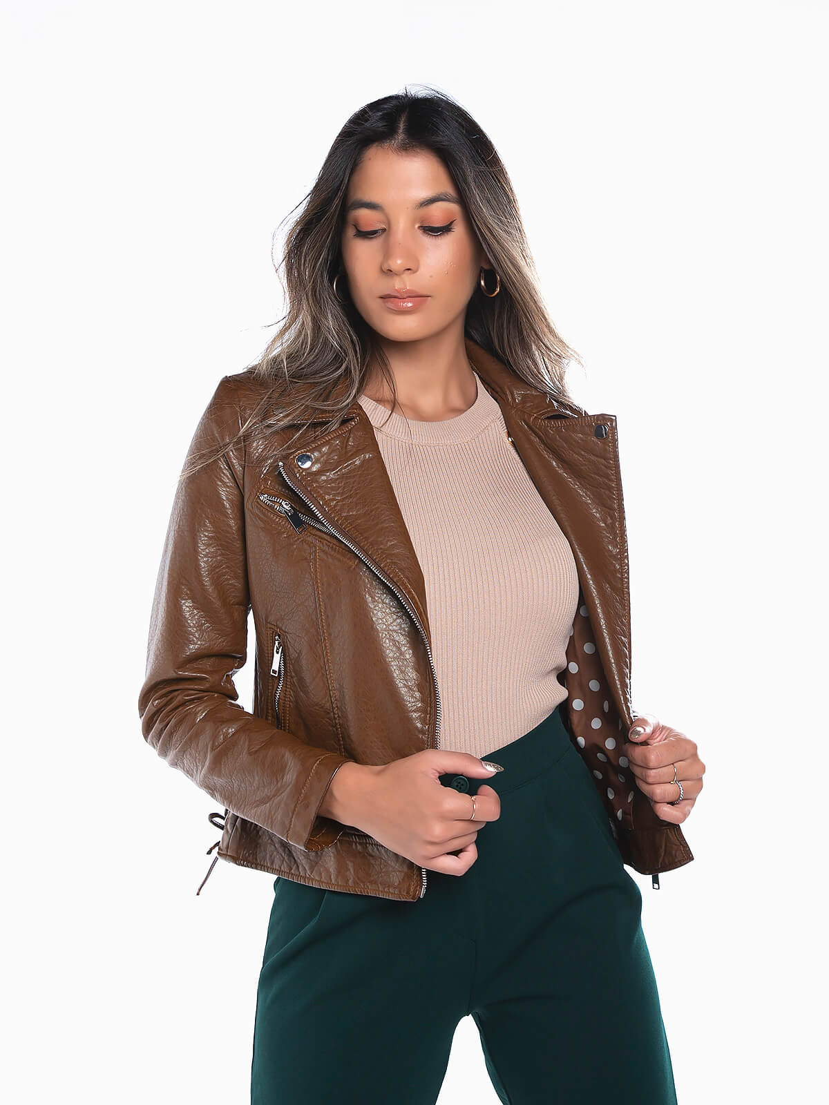 Blusão biker em pele sintética com cordões laterais para ajustar. Blusão com textura e forro às bolas. Gola e lapelas com botões de pressão decorativos. Fecho éclair em viés na frente. 3 bolsos.