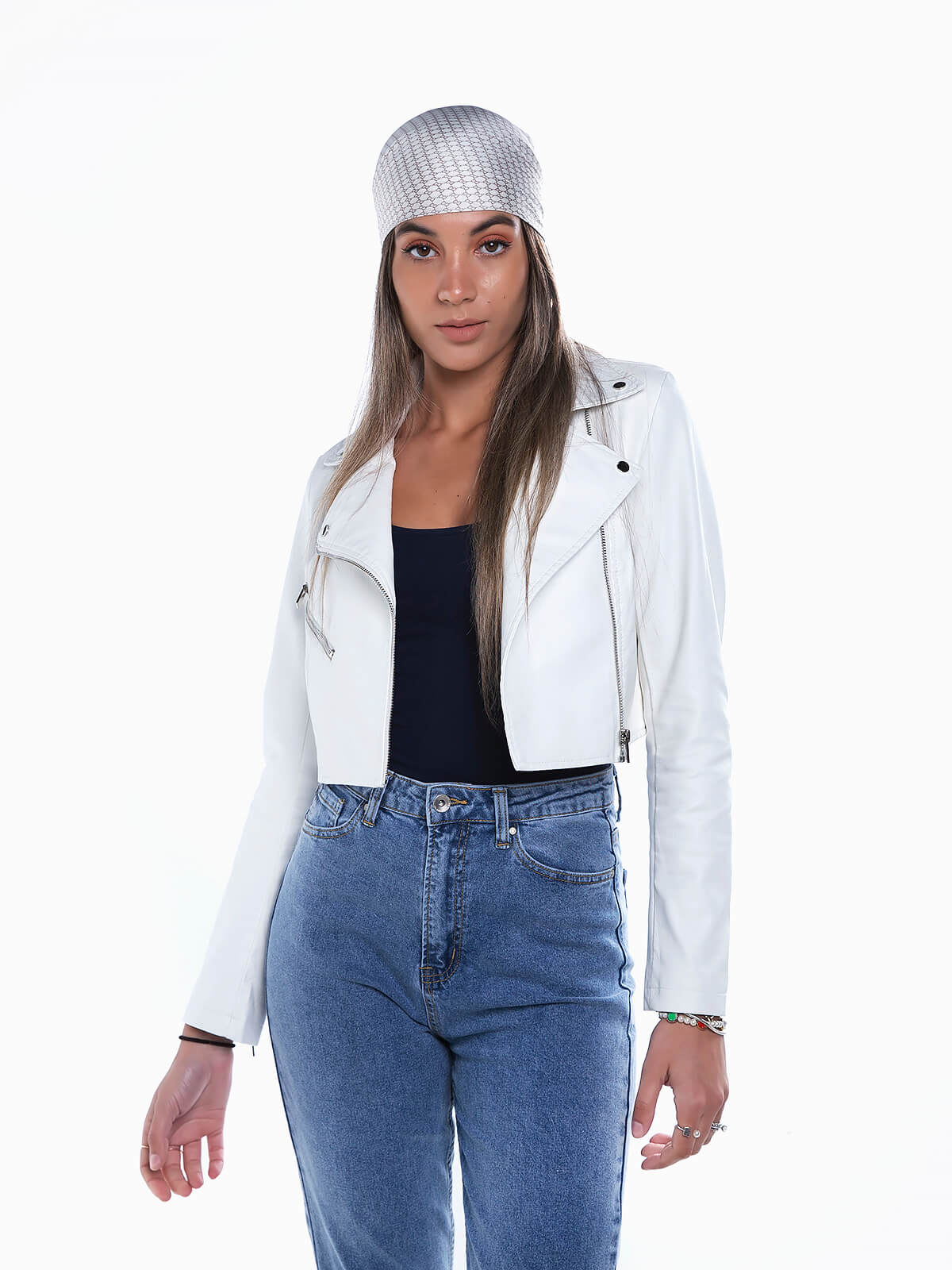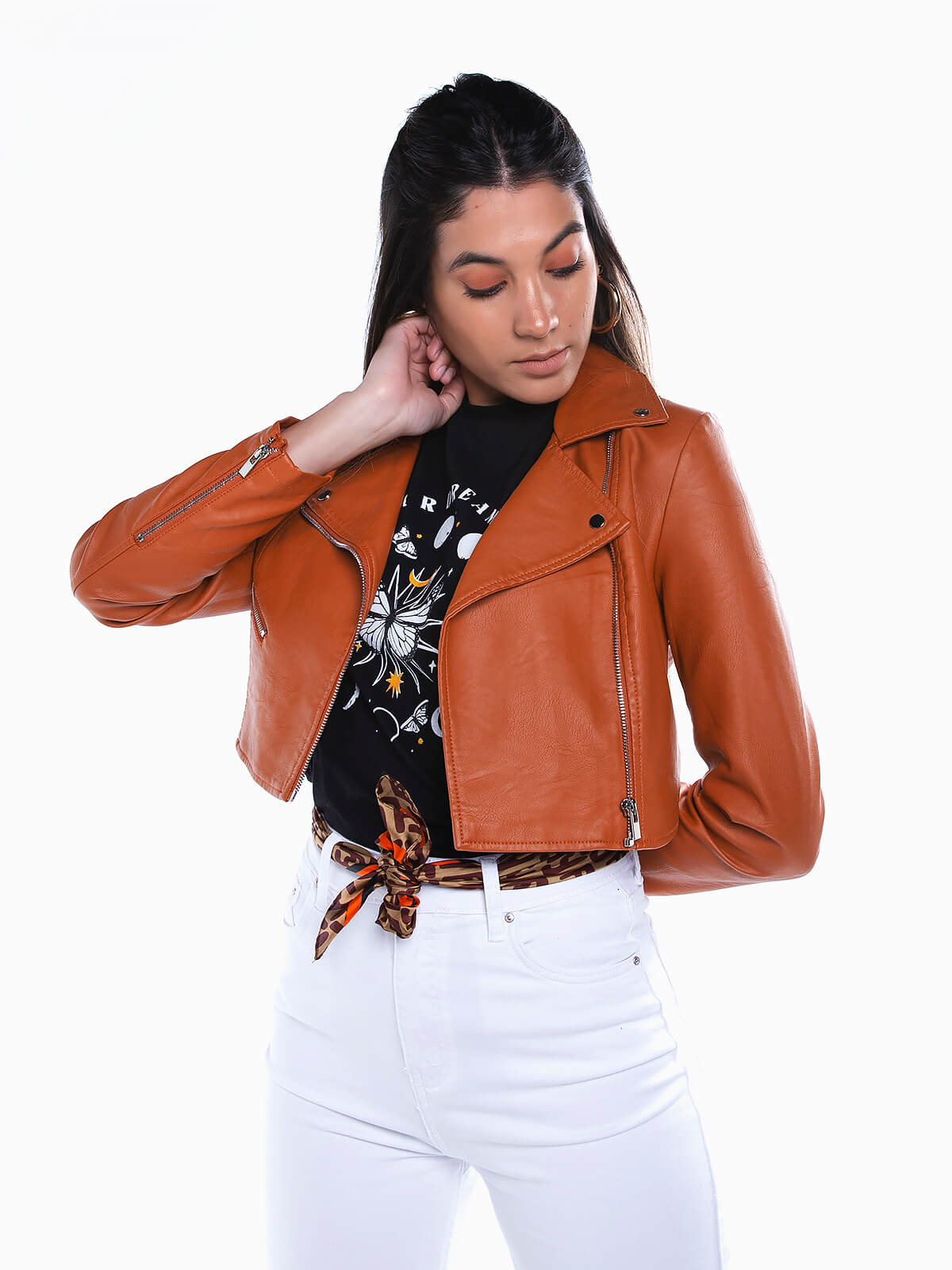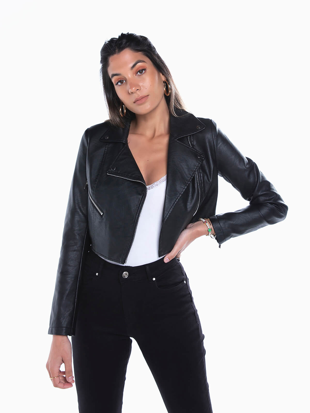 Blusão estilo biker para senhora. Casaco em pele sintética com gola e lapelas com botões de pressão decorativos. Modelo curto. Fecho éclair em viés na frente. 1 bolso.