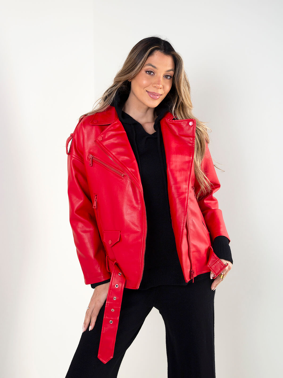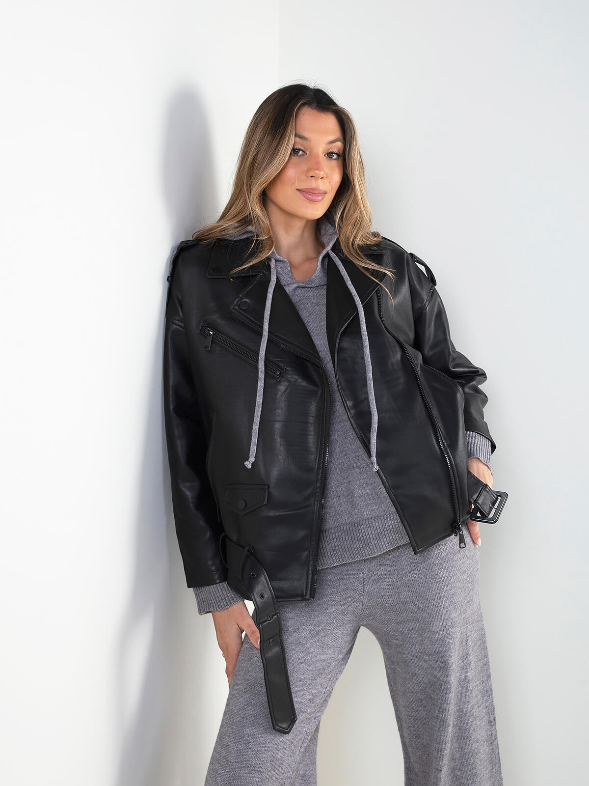 Blusão biker em efeito pele, com fecho assimétrico, bolsos com fecho e cinto ajustável na base. Um modelo marcante, ideal para elevar looks do dia a dia com uma atitude moderna e urbana.
