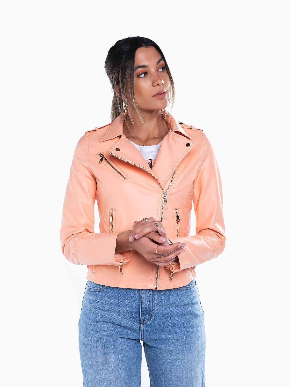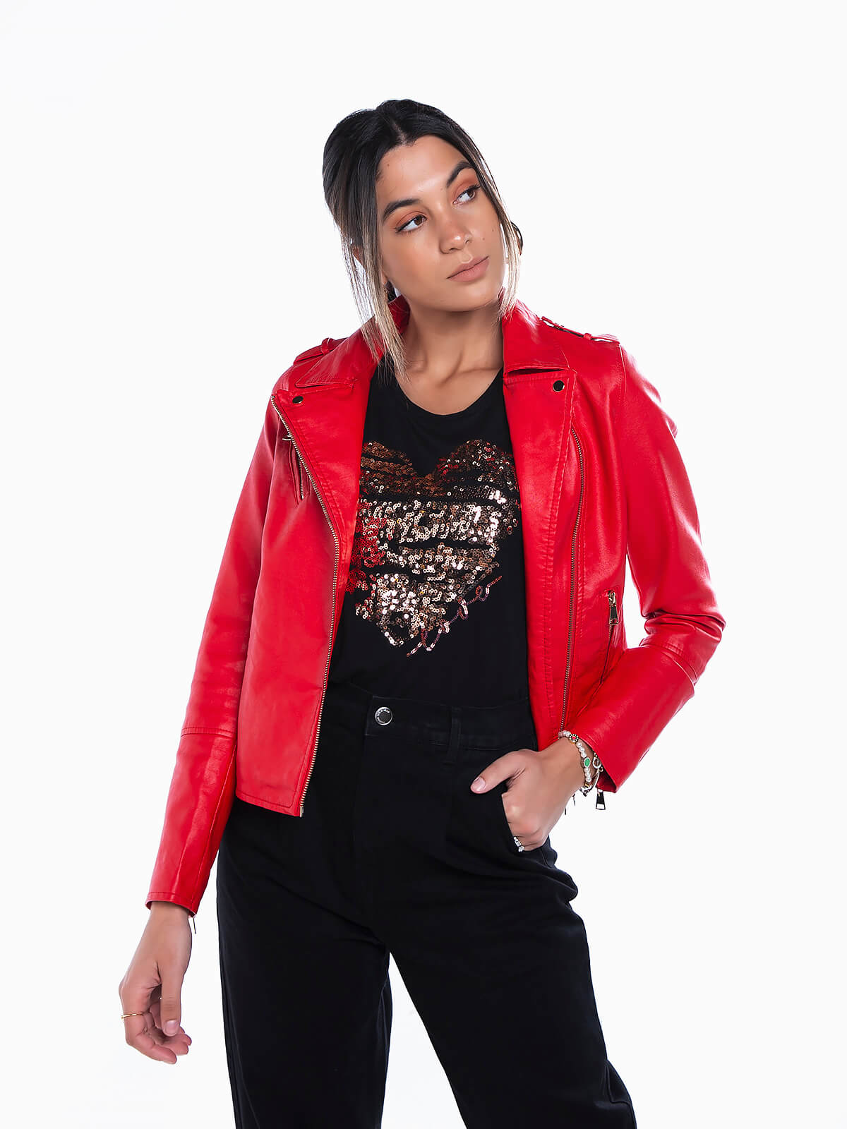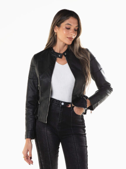 Blusão biker em pele sintética com forro. Gola e lapelas com botões de pressão decorativos. Fecho éclair em viés na frente. 3 bolsos. Ombros com presilhas.