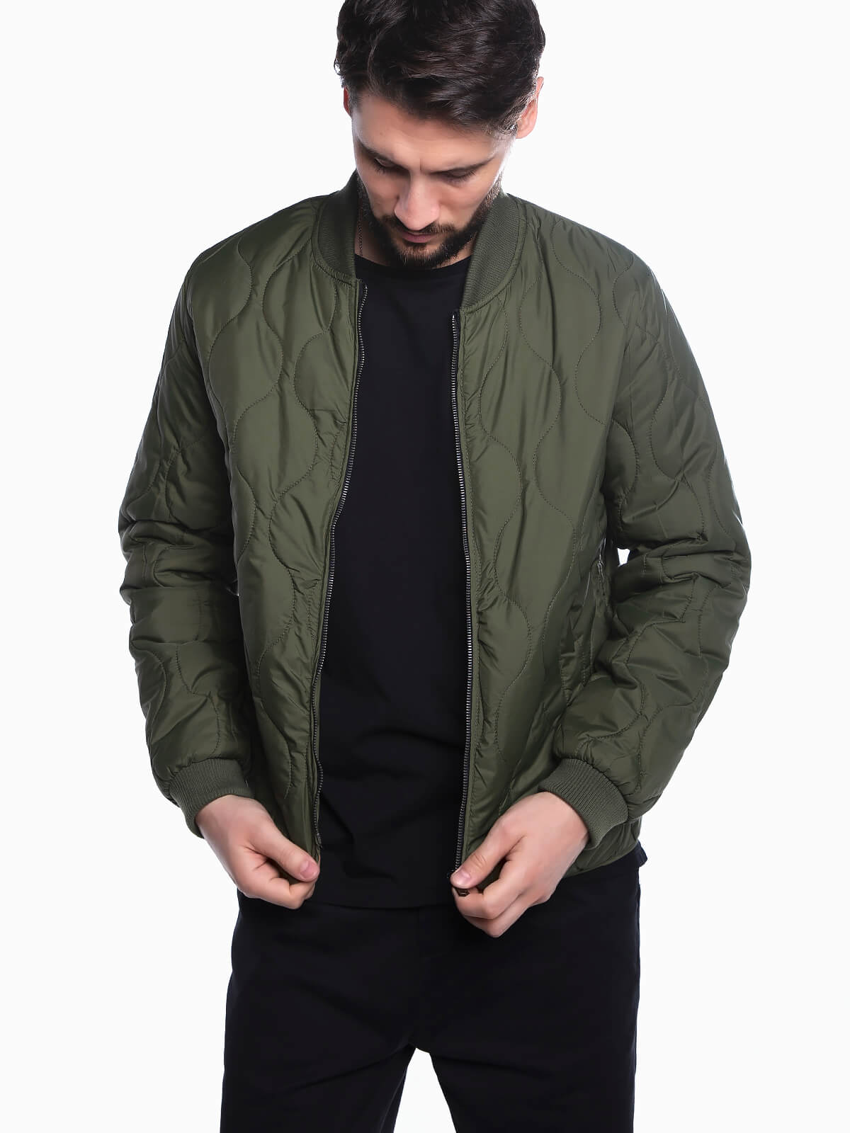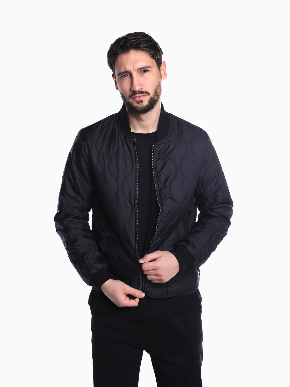 Blusão bomber acolchoado para homem. Blusão impermeável com gola e punhos acabados em nervuras. Manga comprida. Bolso interior. 2 bolsos com abertura debruada. Aperto de fecho zíper.