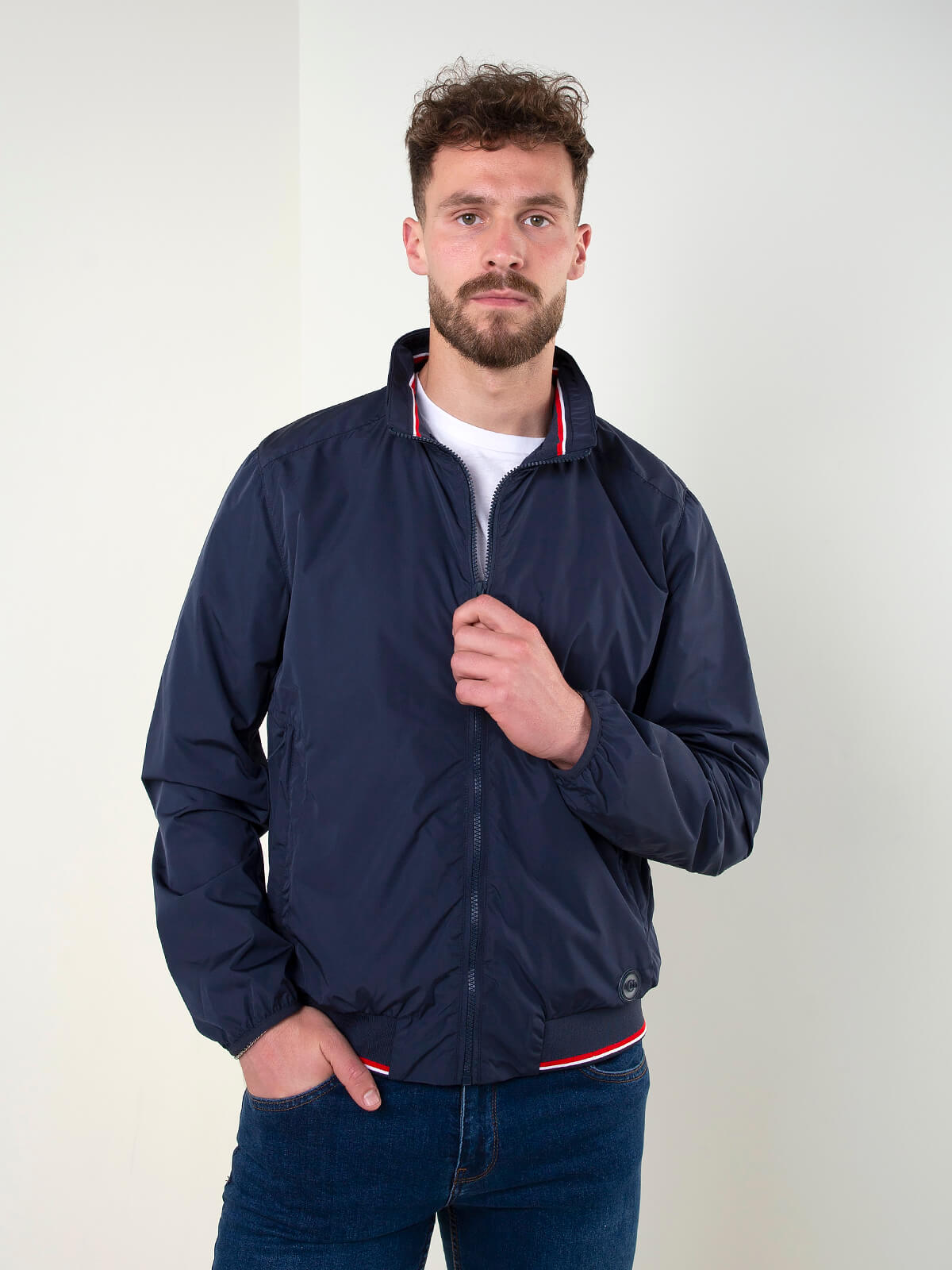 Blusão estilo bomber em tom azul marinho com fecho frontal e gola subida. Modelo leve e confortável, com acabamento elástico nos punhos e na base para um ajuste prático. Detalhes em contraste que reforçam o estilo desportivo. Ideal para looks casuais de meia-estação.