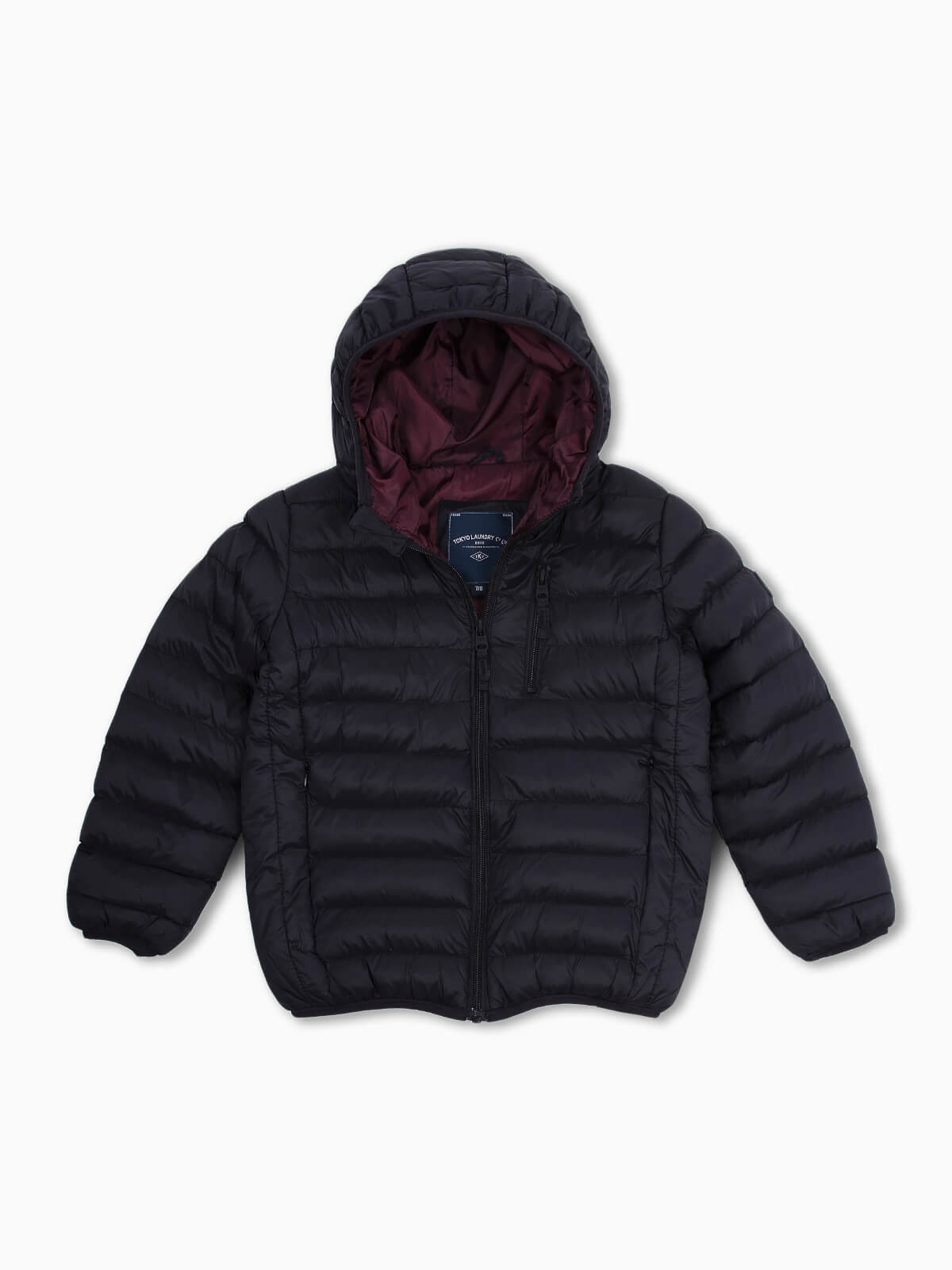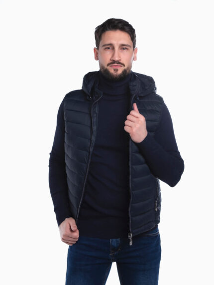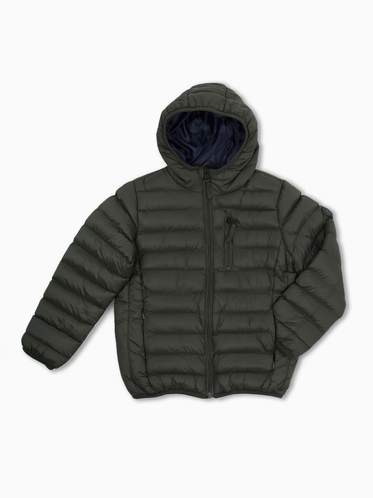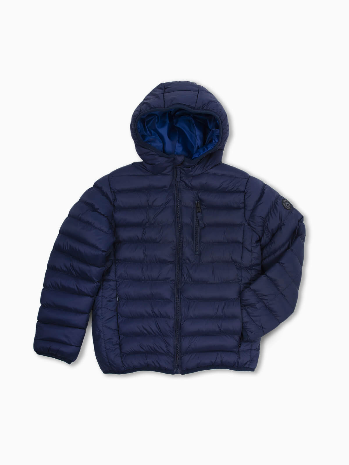 Blusão com capuz acolchoado para menino. Blusão impermeável de manga comprida com dois bolsos laterais e um no peito. Símbolo aplicado. Aperto de fecho zíper.