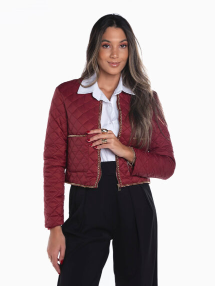Blusão cintado gola alta com pelo dentro. Blusão impermeável curto com costuras em losango. Bolsos laterais com fecho. Aperto de fecho éclair.
