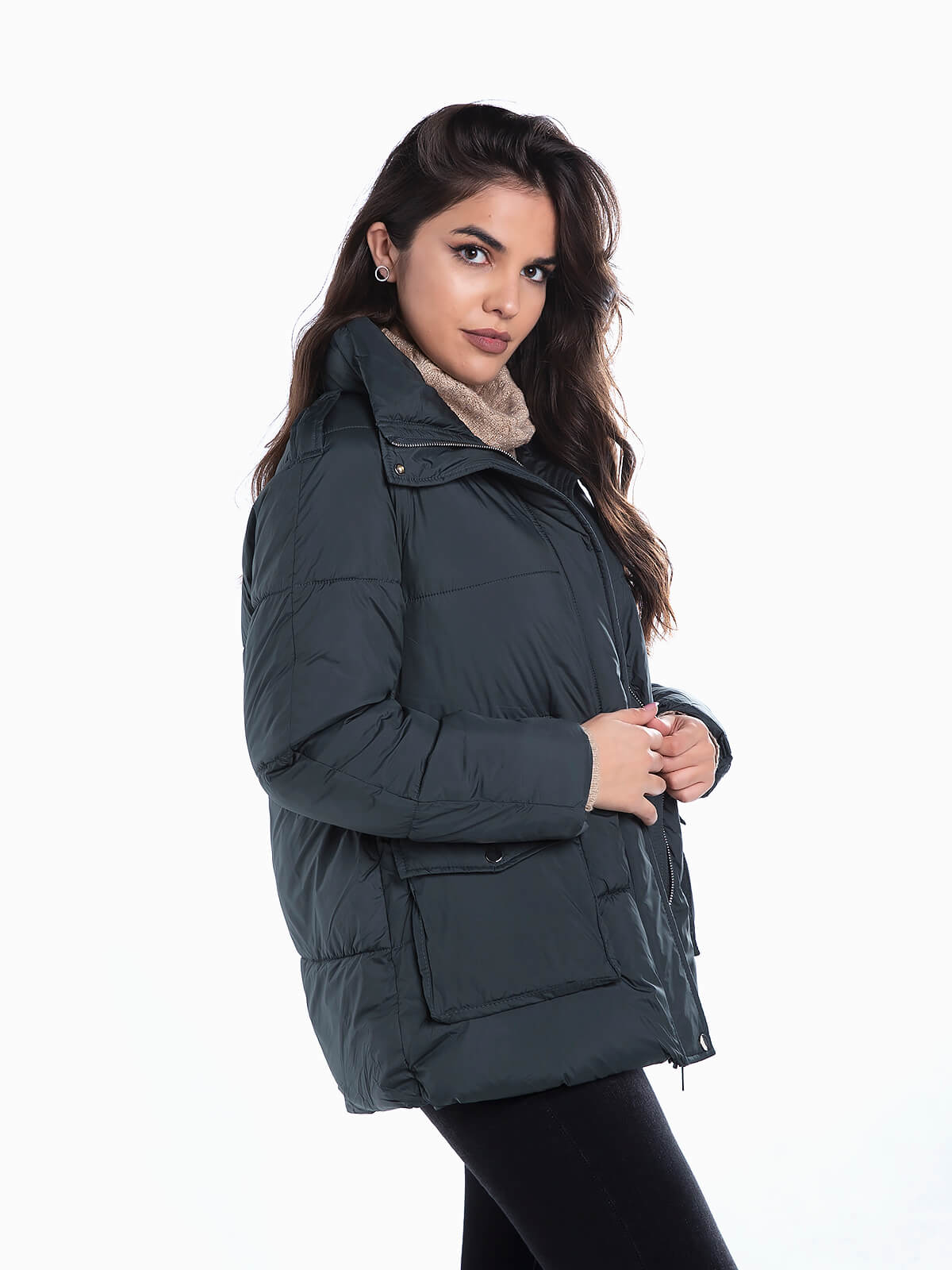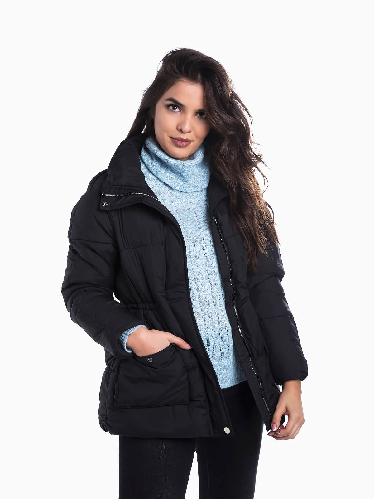 Blusão cintado impermeável com gola alta. Blusão com cordão para ajustar na cintura. Bolsos pala frontais. Aperto com fecho de correr sob aba com botões de mola.
