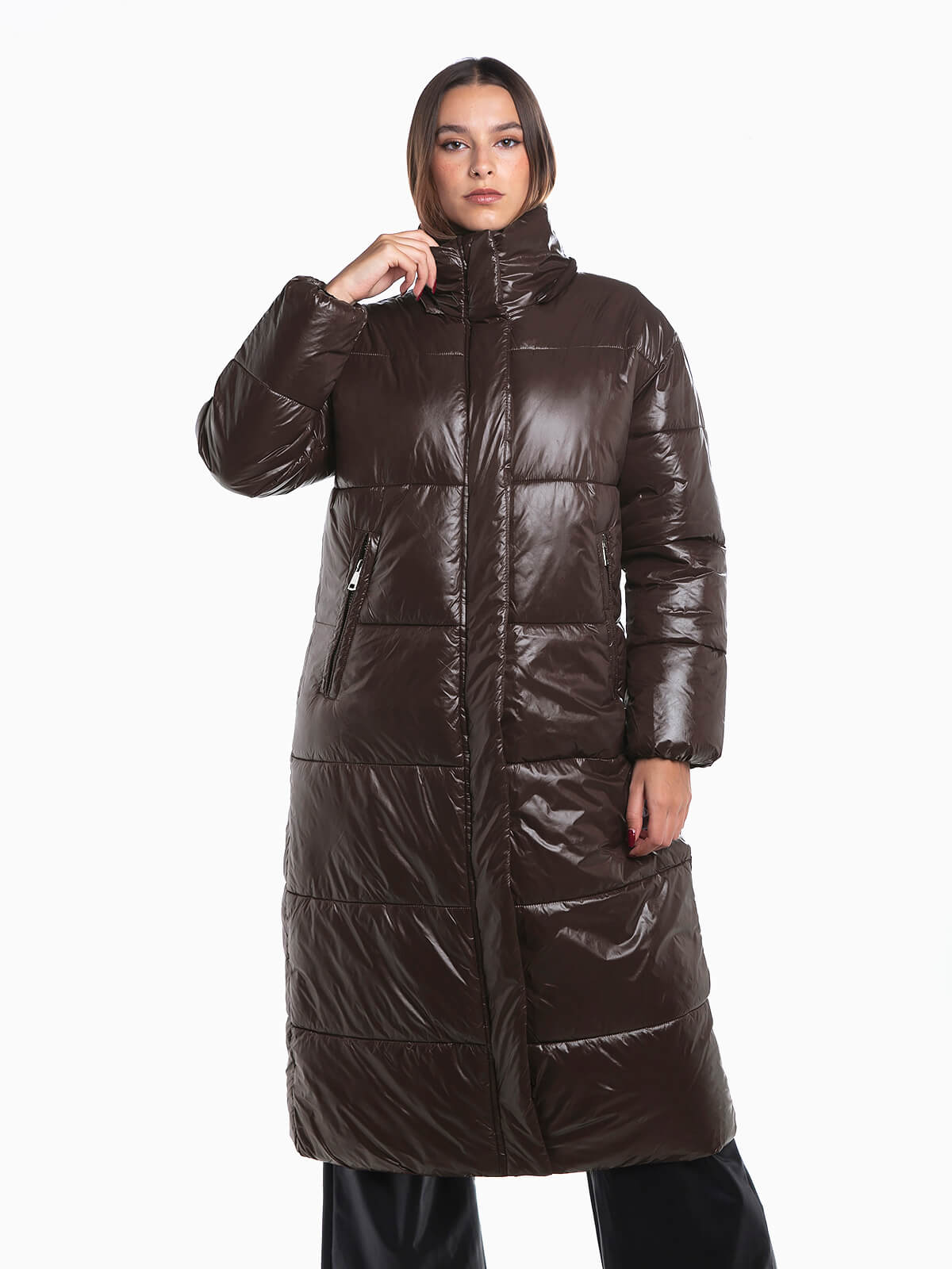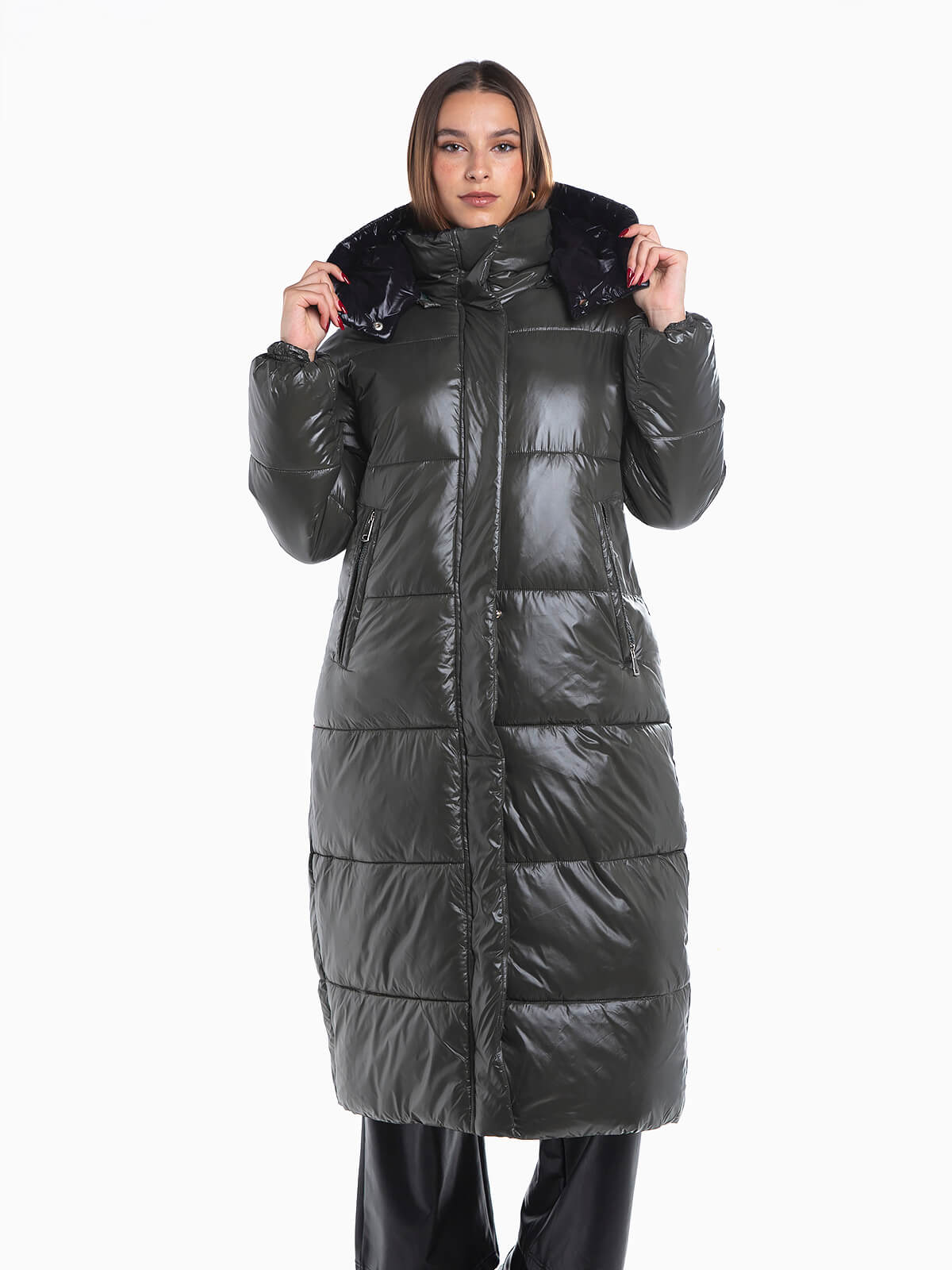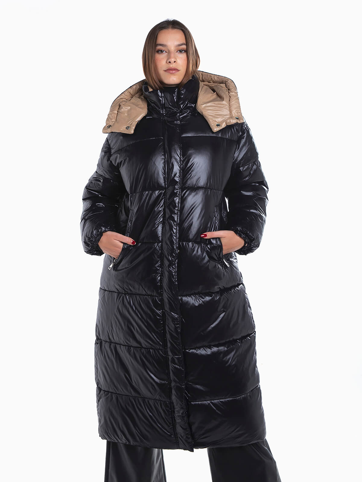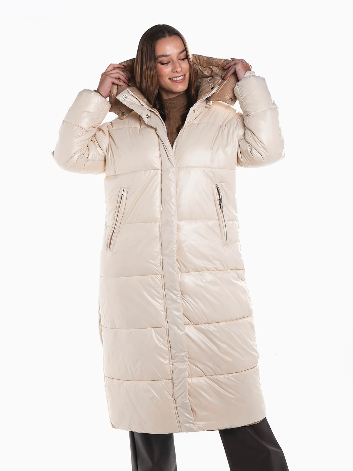 Blusão comprido acolchoado brilhante para senhora. Blusão impermeável com capuz removível. Manga comprida. 2 bolsos. Aperto de fecho zíper e botões pressão.