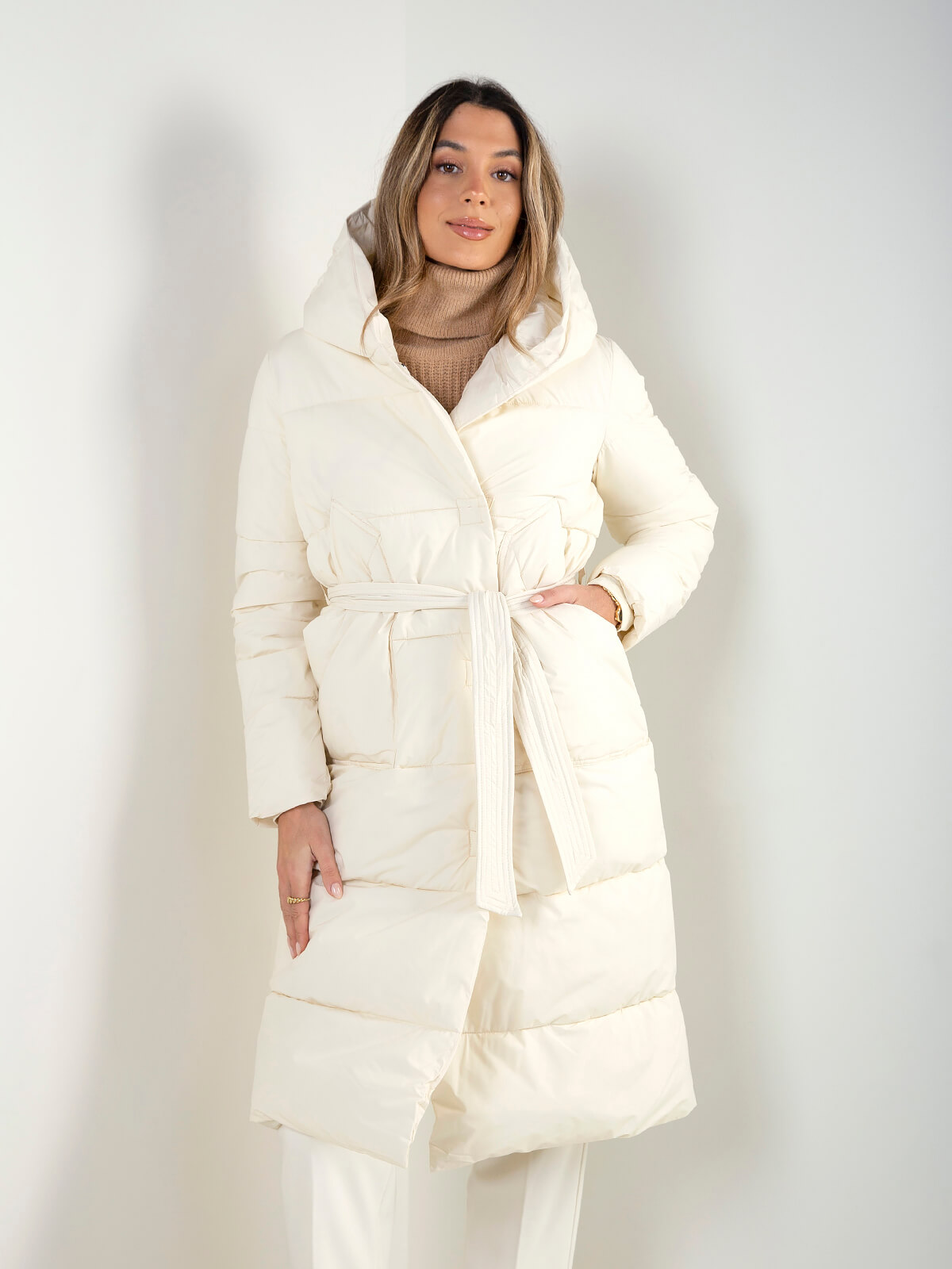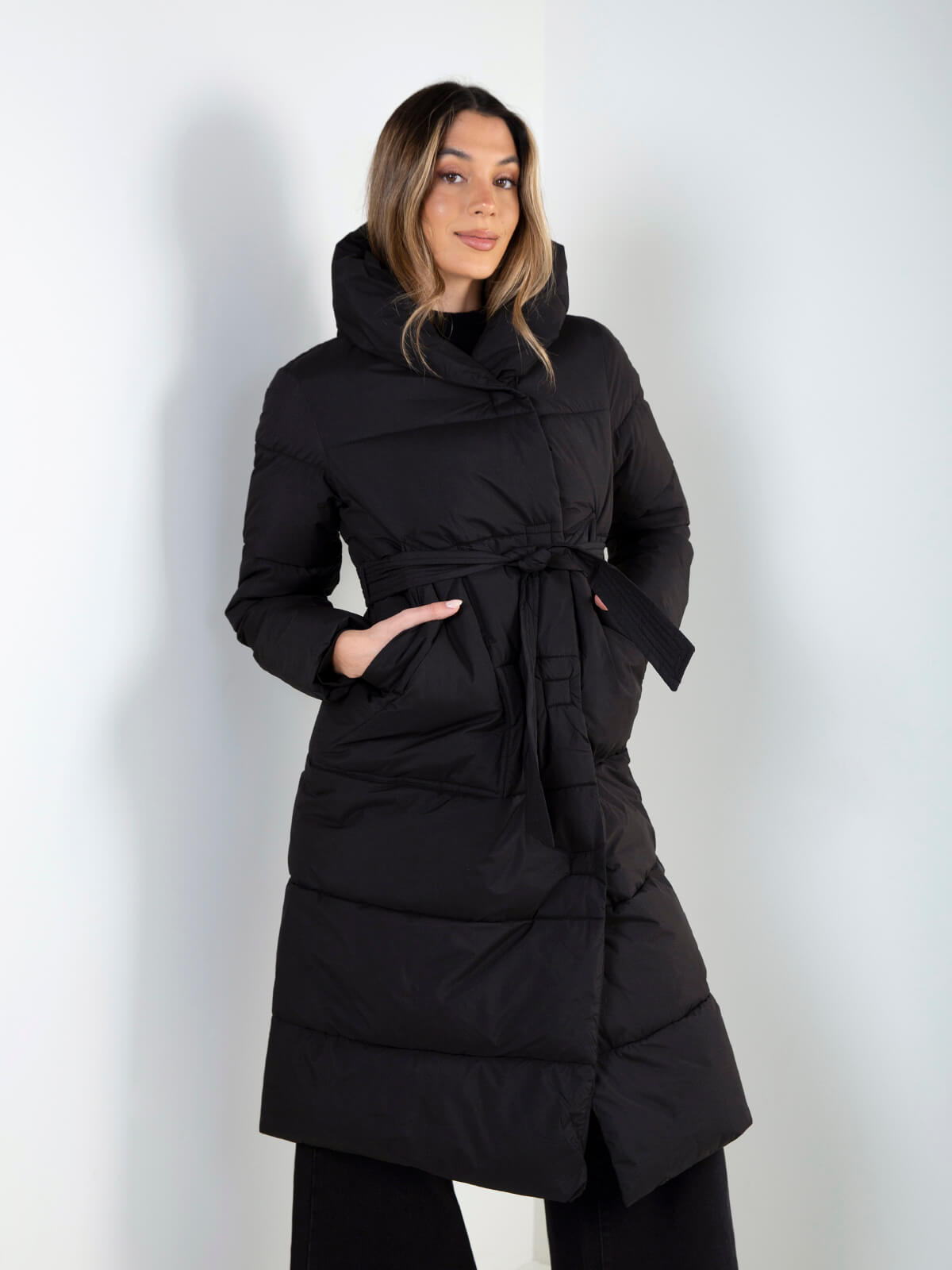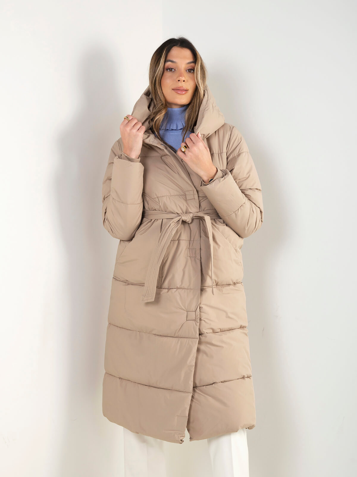 Blusão comprido acolchoado com capuz envolvente e cinto ajustável na cintura. Modelo quente e confortável, com bolsos laterais funcionais e fecho frontal oculto. Ideal para enfrentar o frio com um look prático, elegante e fácil de combinar.