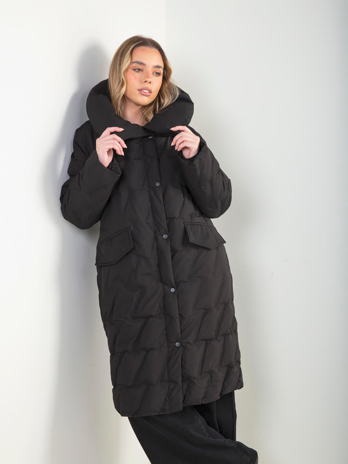 Blusão comprido acolchoado com gola larga estruturada, manga comprida e fecho frontal com botões de pressão. 2 bolsos. Modelo impermeável e confortável, ideal para looks de inverno práticos e atuais.