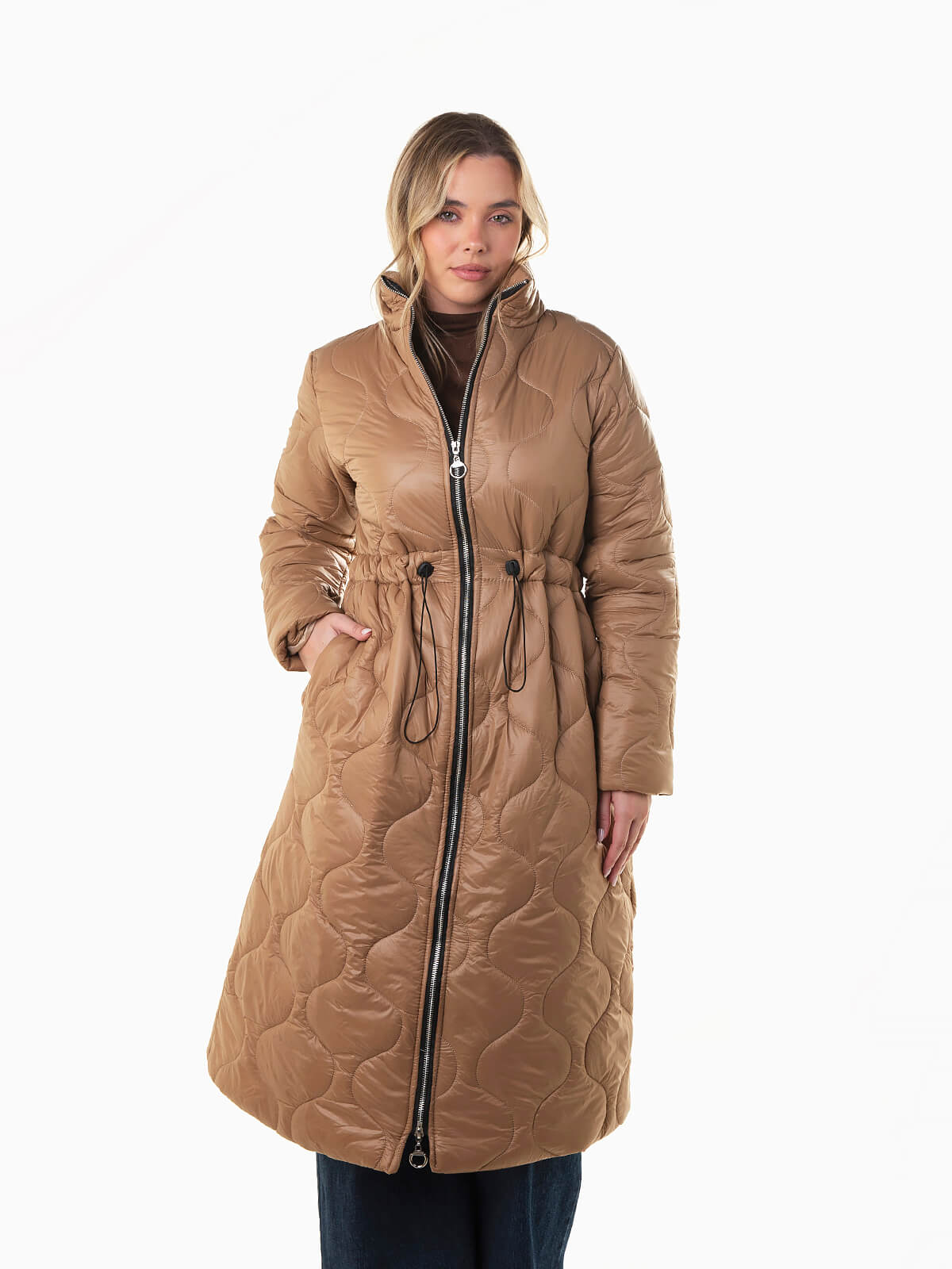 Blusão comprido acolchoado e impermeável, com gola subida e elástico na cintura ajustável com cordão. Modelo funcional com dois bolsos laterais e aperto frontal de fecho zíper. Ideal para os dias frios e de chuva ligeira.