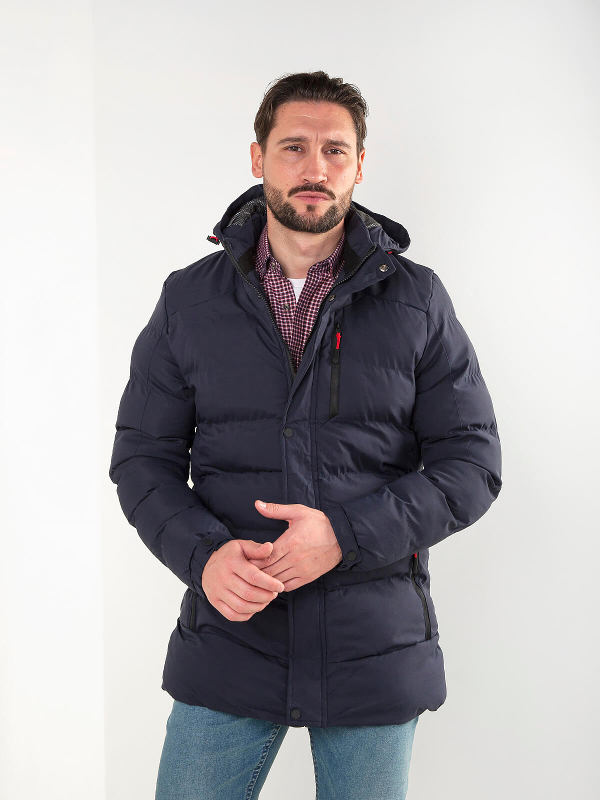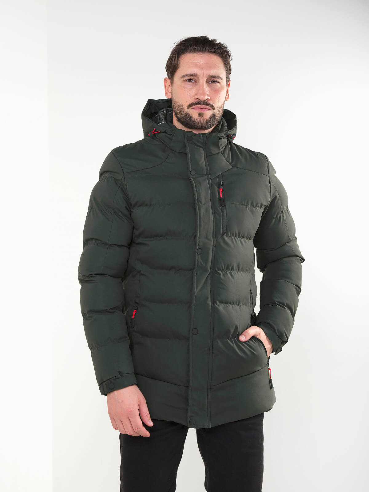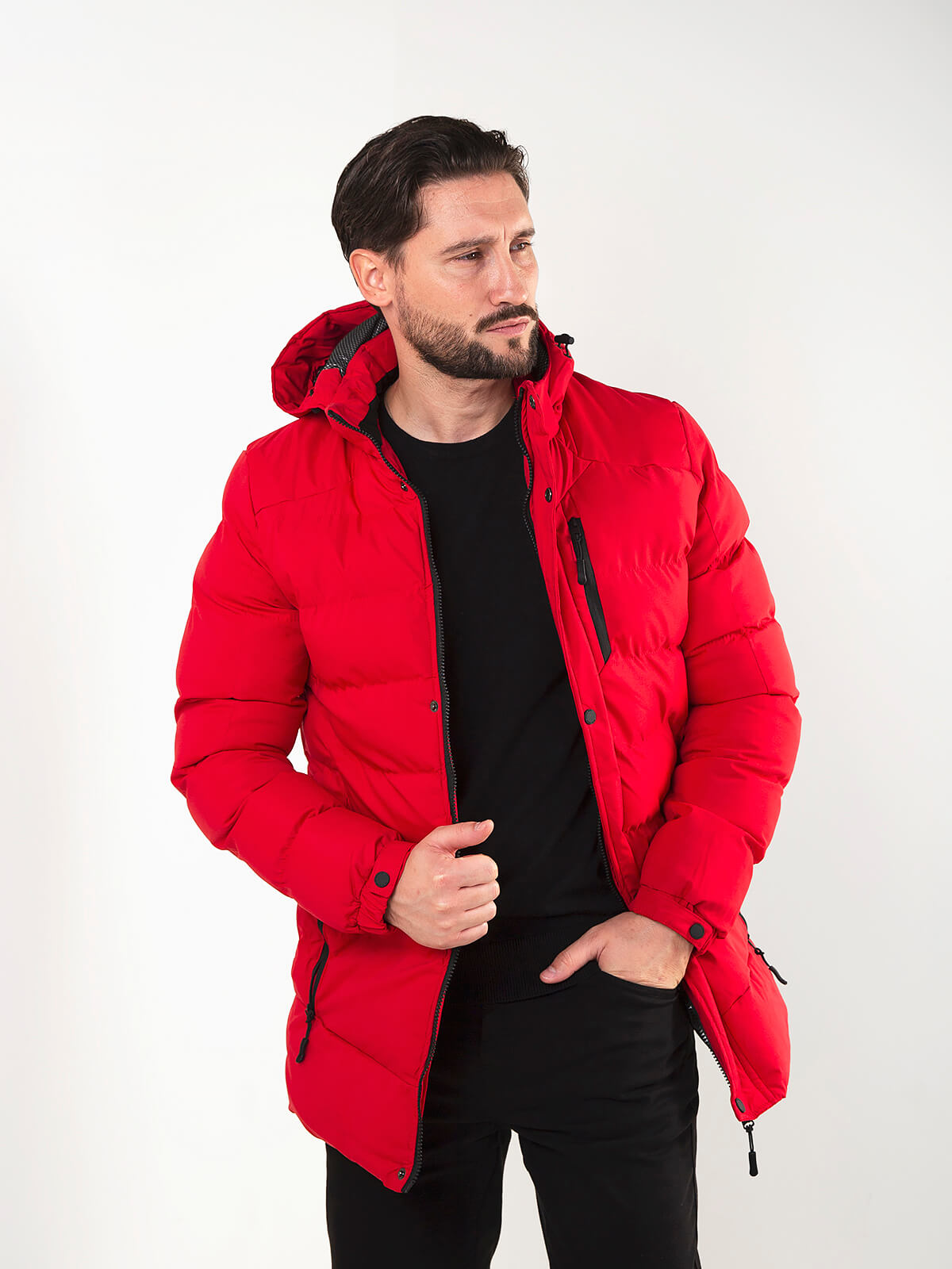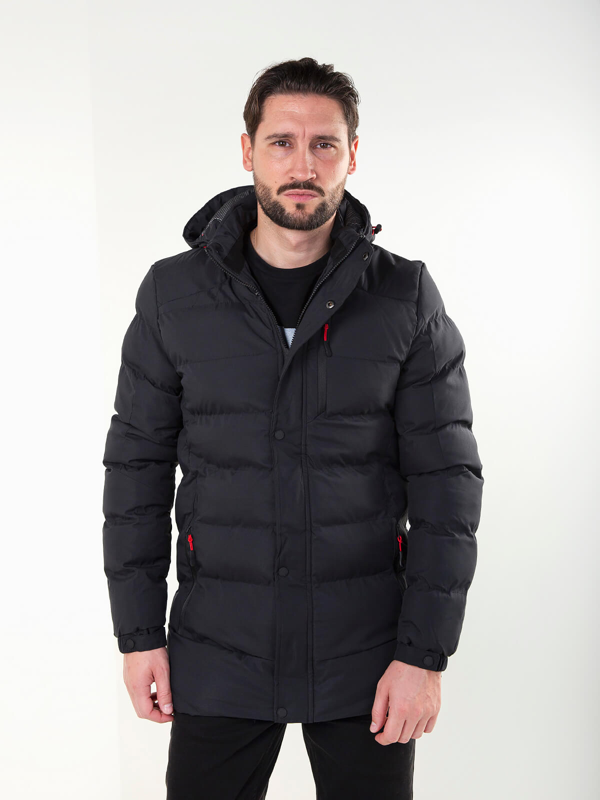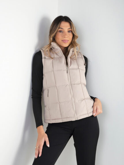 Blusão acolchoado, quente e confortável, com capuz ajustável, bolsos com fecho e detalhe técnico. Ideal para o frio e para looks casuais de inverno.