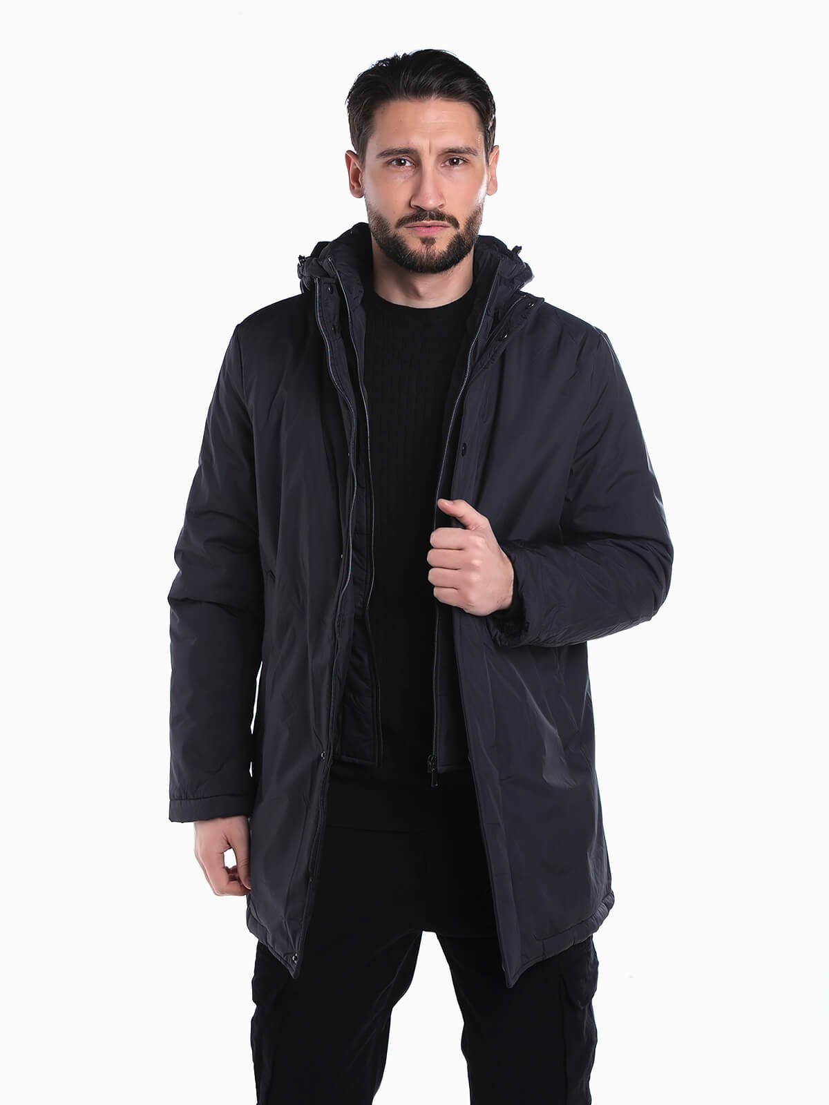 Blusão comprido impermeável com acolchoado leve. Blusão combinado com capuz e tecido removível à frente. 2 bolsos laterais e 2 interiores. Aperto fecho zíper e botões pressão.