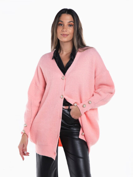 Casaco de ganga de colarinho de aba e manga comprida com punhos abotoados. Blusão com lavagem azul e pormenor de bolsos no peito e fecho de botões à frente. Bolsos verticais e presilhas no cós.