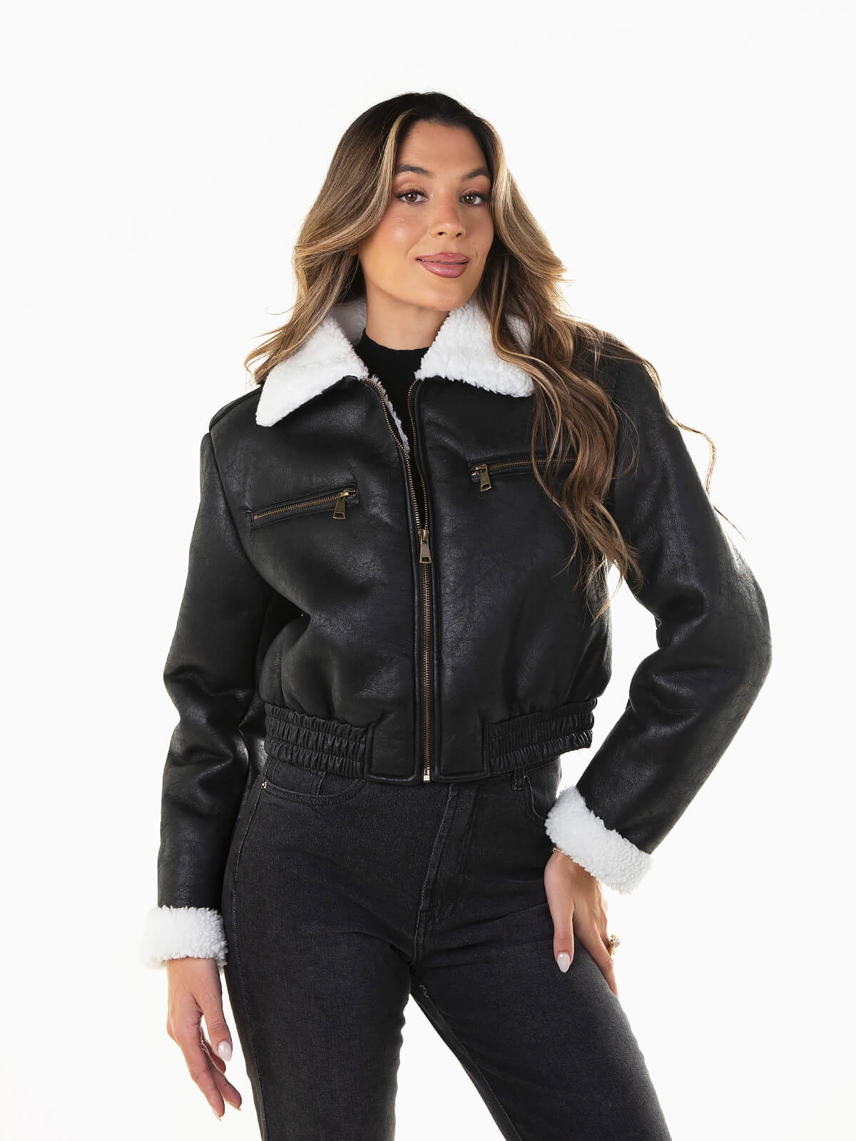 Blusão dupla face em tecido efeito pele com interior em pelo suave. Modelo curto com fecho zíper e gola larga. Combina-o com calças de ganga e botas para um look casual, ou com calças efeito pele para um visual mais urbano e atual.