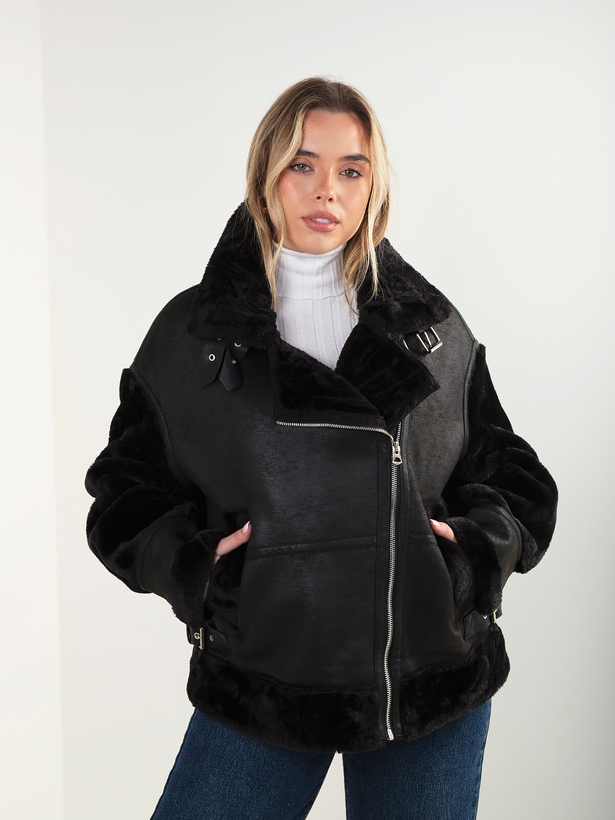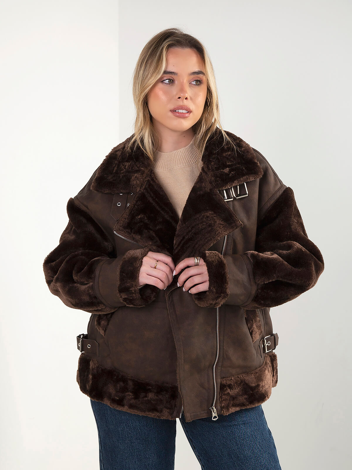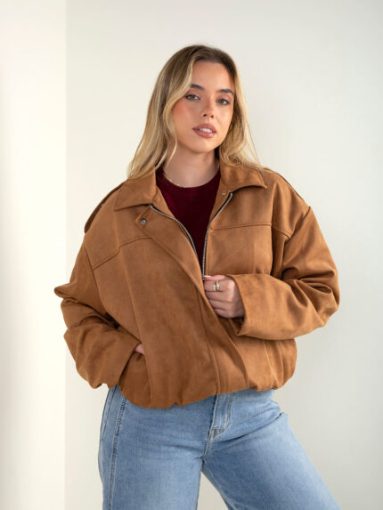 Blusão de mulher em efeito camurça com pelo macio, acabamento estilo dupla face, 2 bolsos e corte confortável. Combina com malha clara e jeans de cintura alta para um look cozy e moderno.