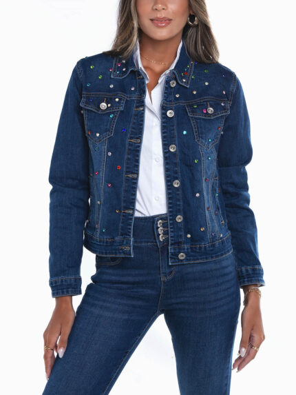 Blusão de ganga com lavagem azul escuro para senhora. Casaco elástico manga comprida com punhos abotoados e 4 bolsos. Gola de abas. Aperto frontal de botões.