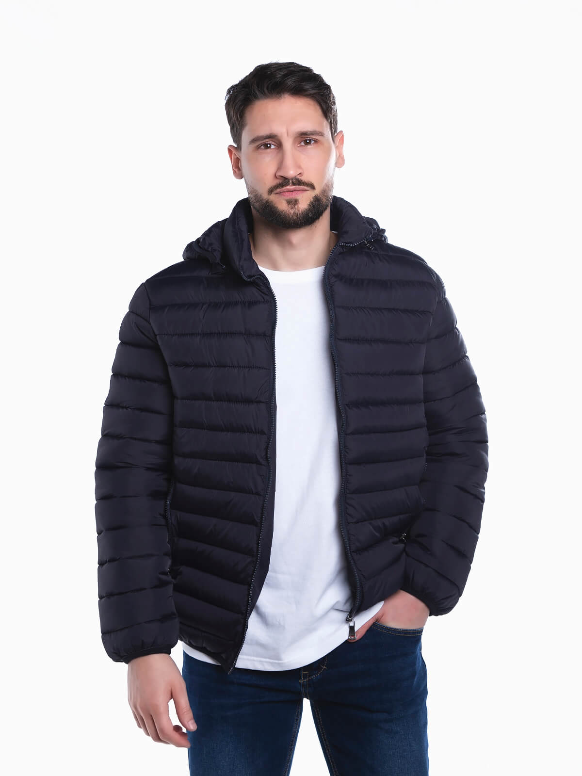 Blusão impermeável acolchoado com capuz removível. Blusão para homem de manga comprida com gola subida. Bolso interior e dois bolsos à frente. Aperto de fecho zíper.