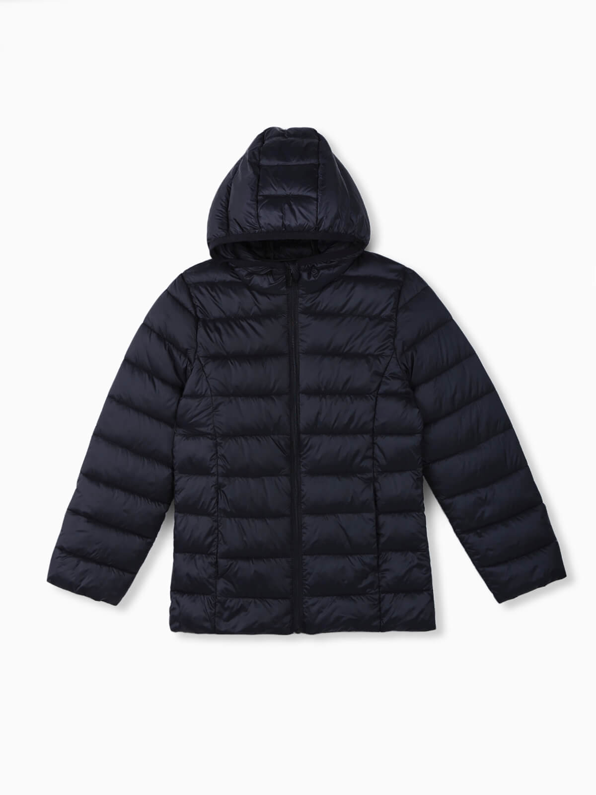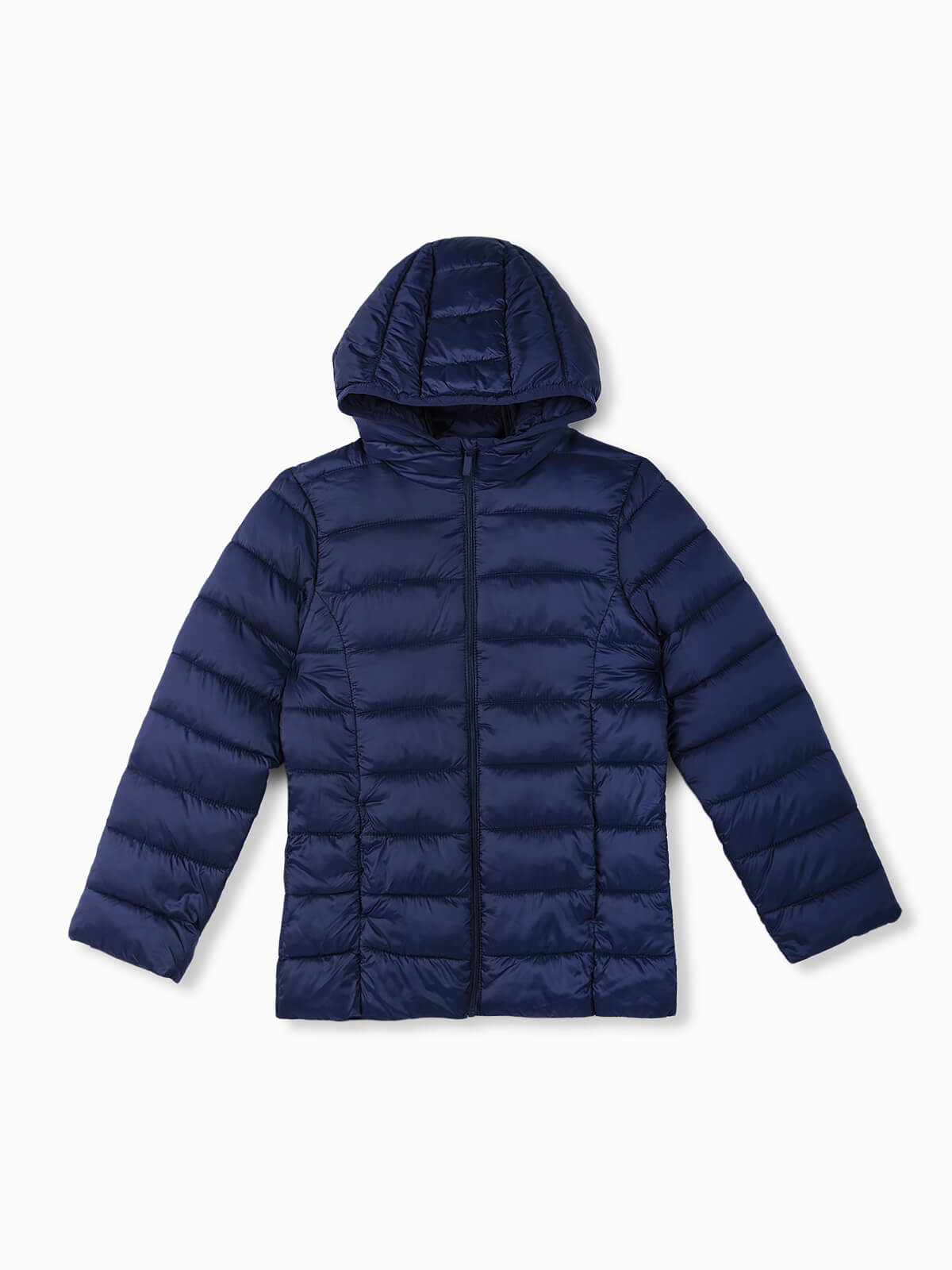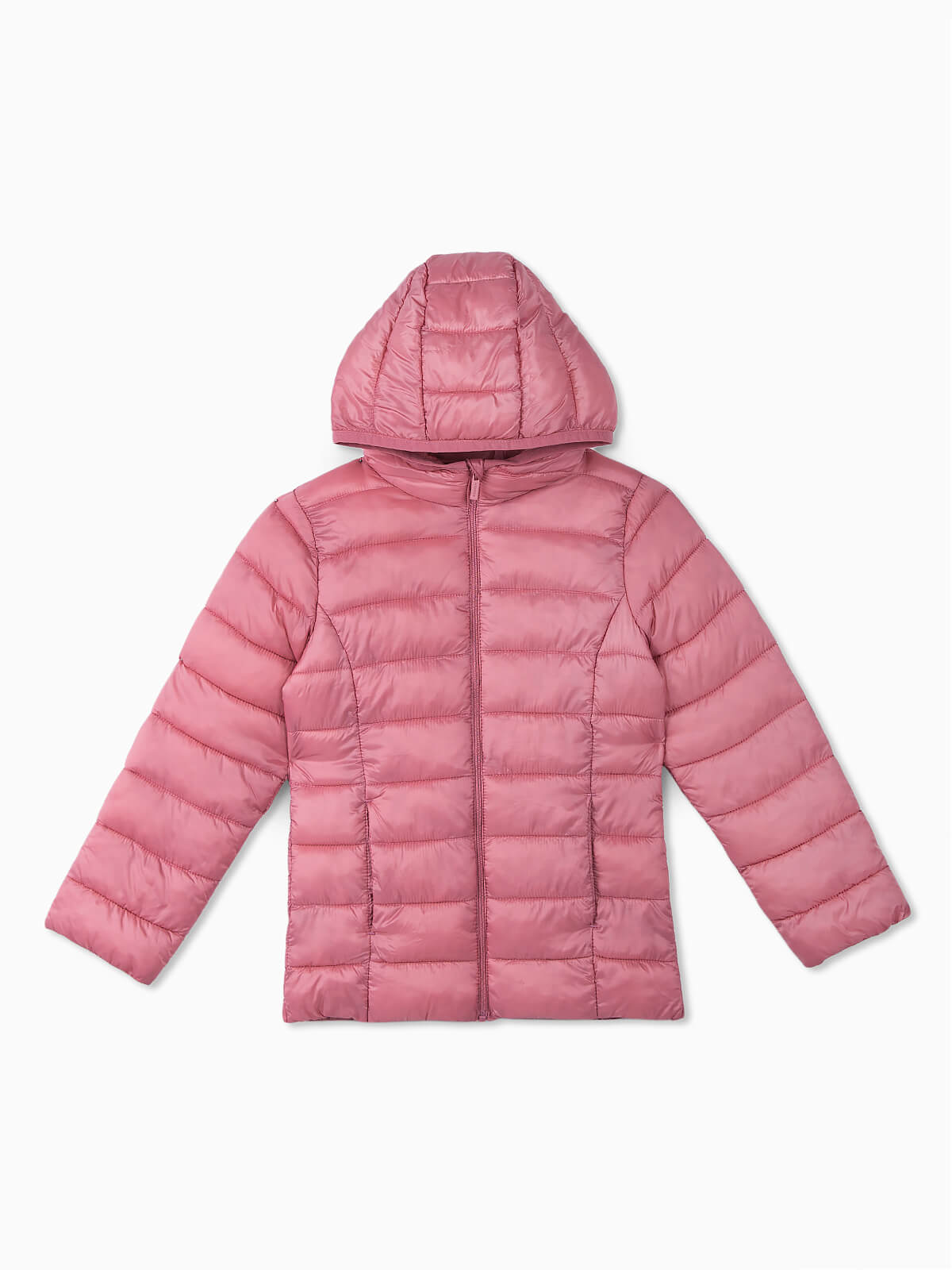 Blusão impermeável com acolchoado leve para menina. Blusão com capuz e gola subida. Manga comprida. 2 bolsos. Aperto frontal de fecho éclair.