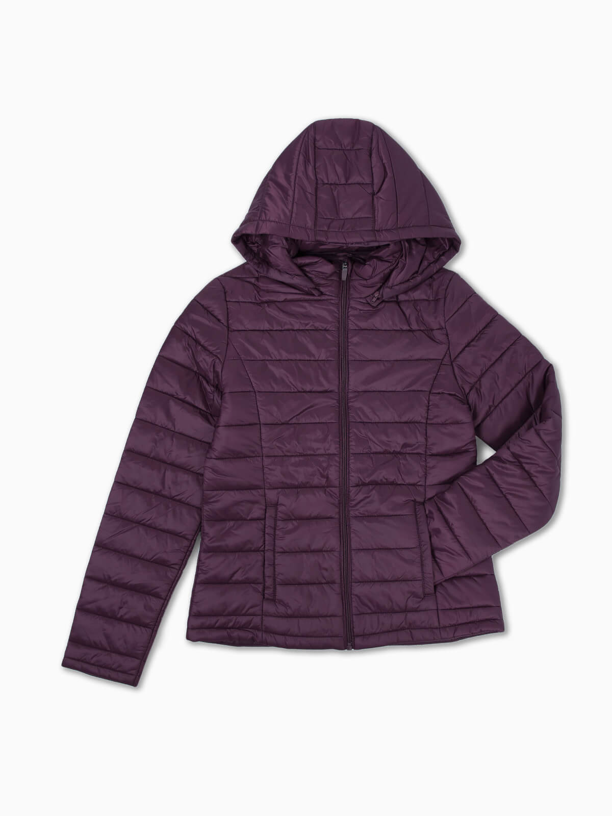 Blusão impermeável acolchoado para senhora. Blusão acolchoado fino com capuz removível. Gola subida. 2 bolsos com abertura debruada. Manga comprida. Aperto de fecho éclair.