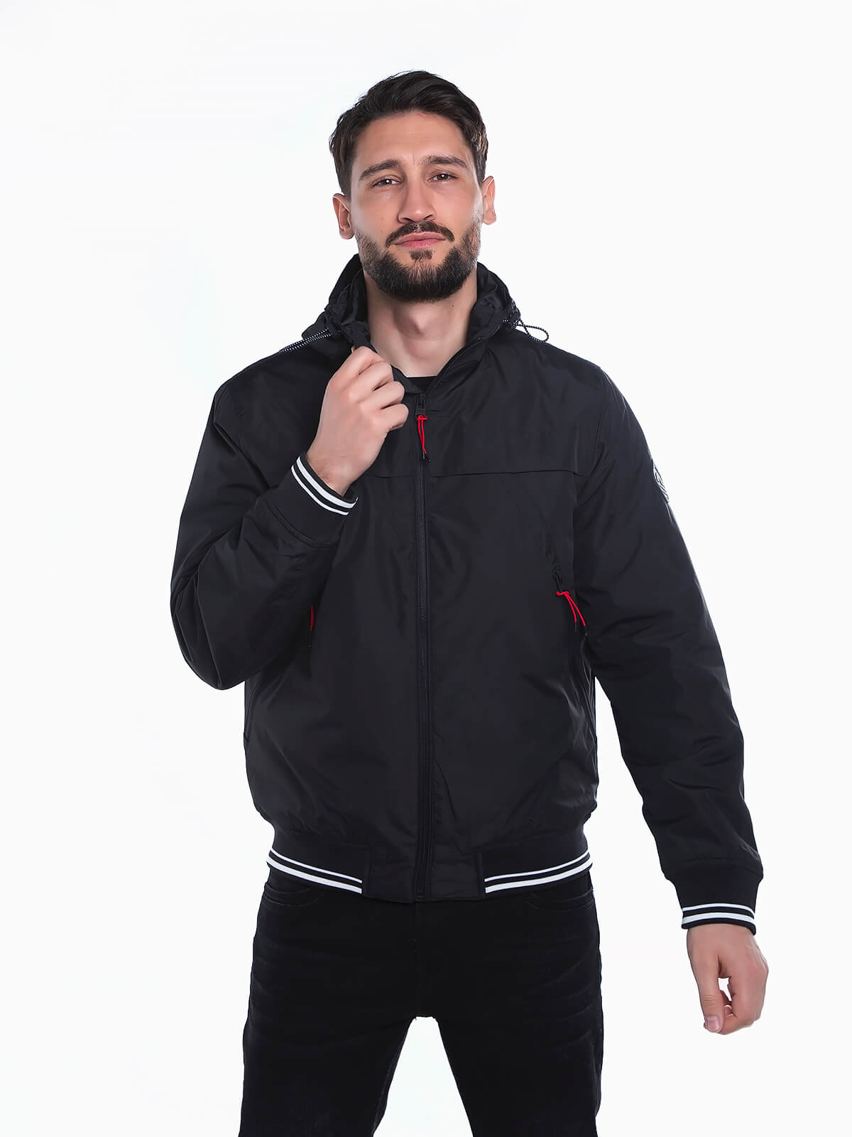 Blusão impermeável com capuz e elástico para ajustar. Casaco manga comprida com símbolo na manga. Gola subida. Bolso inteiror e dois bolsos laterais. Acabamentos elásticos com pormenores de riscas.