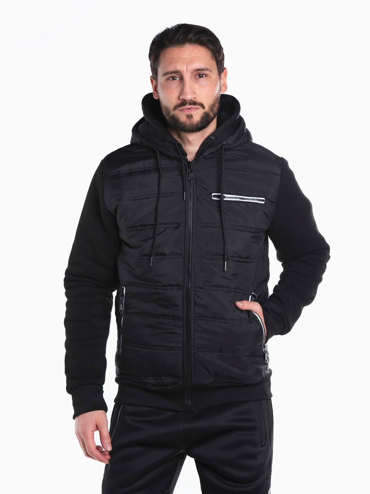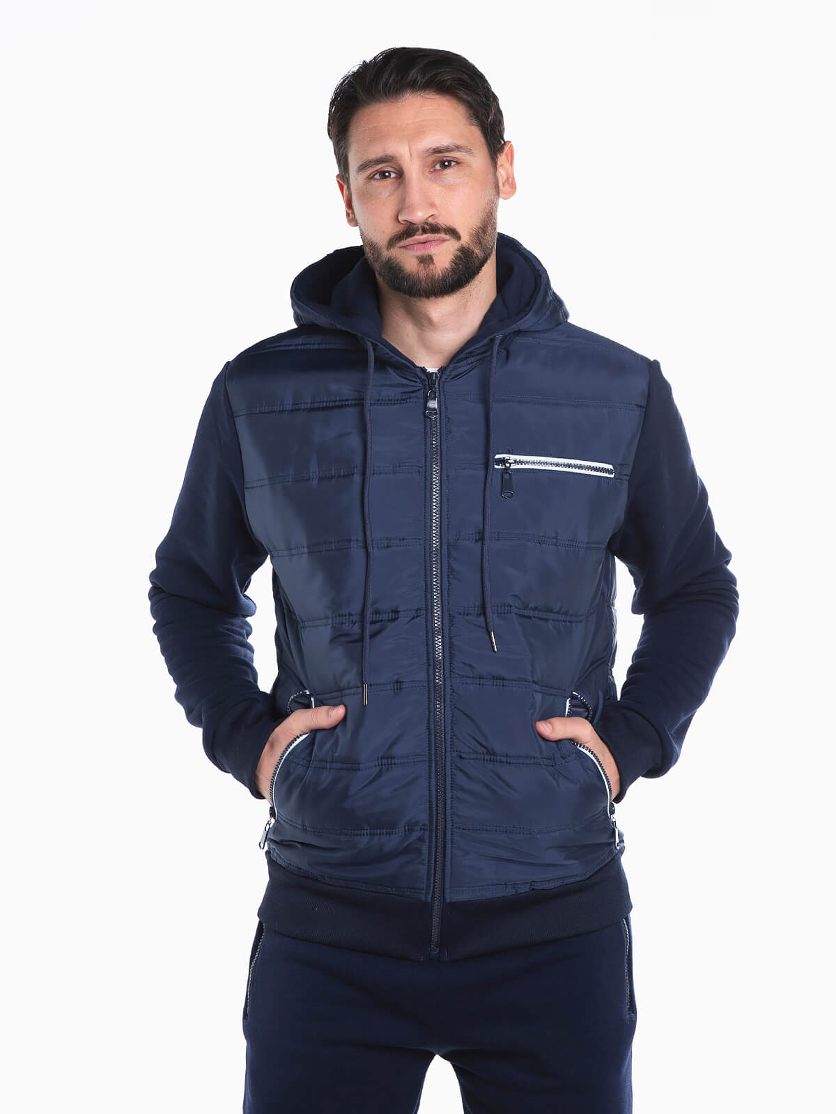 Blusão impermeável combinado com felpa nas mangas. Blusão acolchoado leve com capuz e cordão para ajustar. Cotoveleiras. 3 bolsos. Aperto de fecho zíper. Acabamentos elásticos.